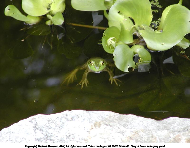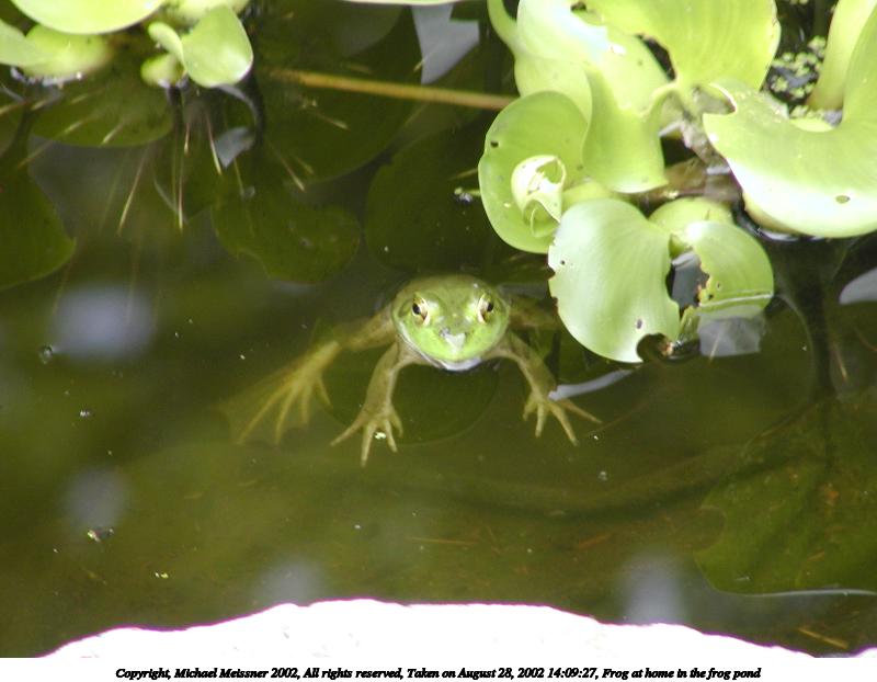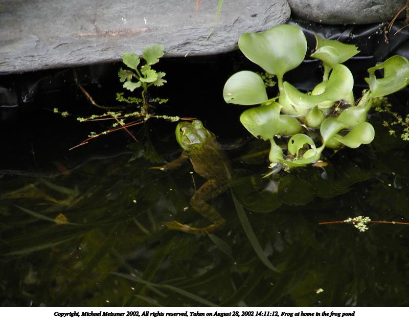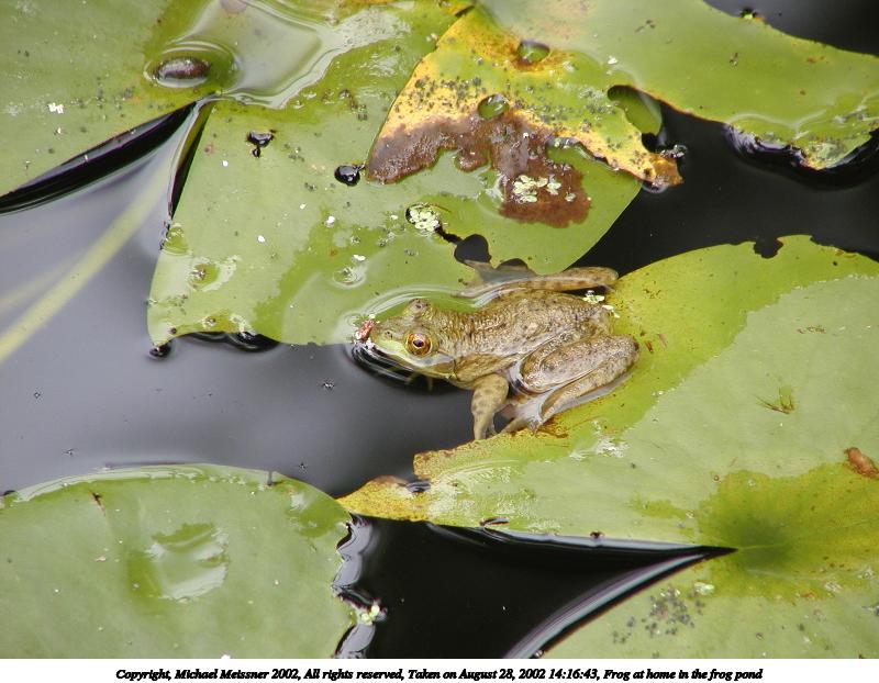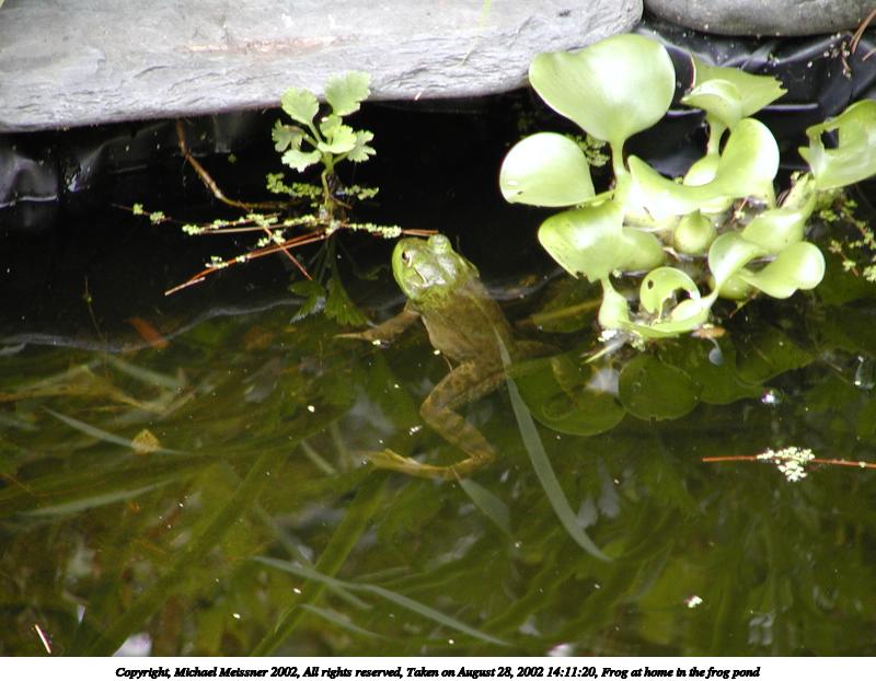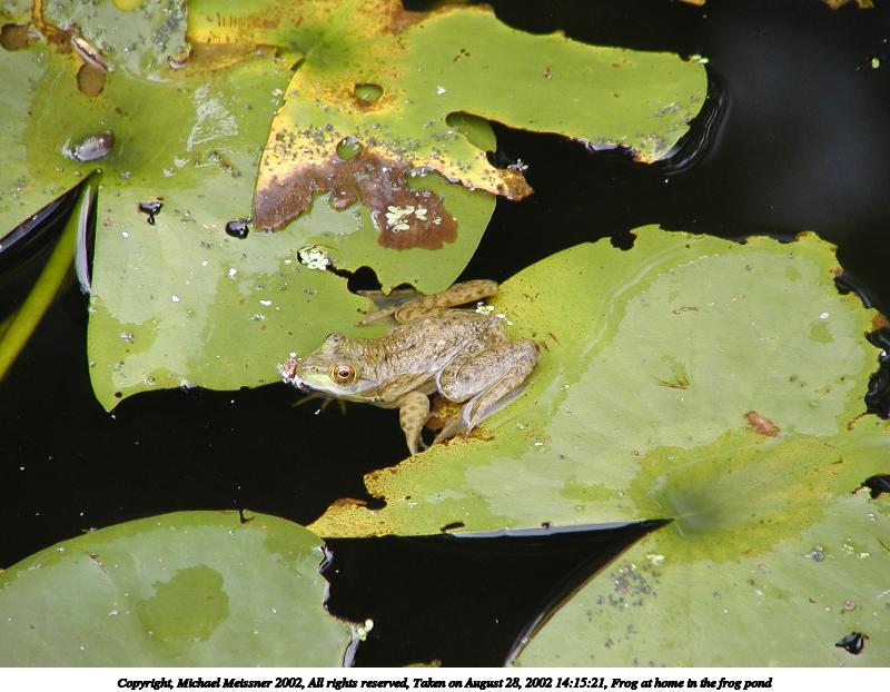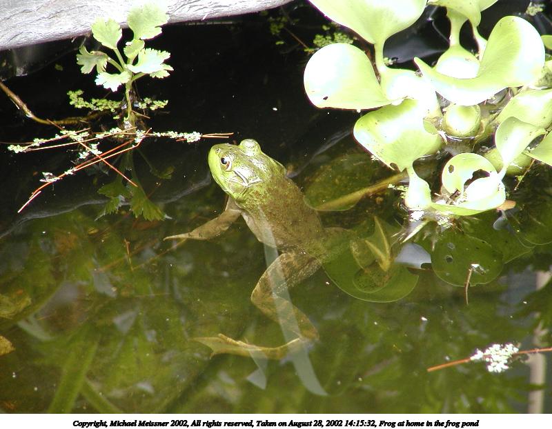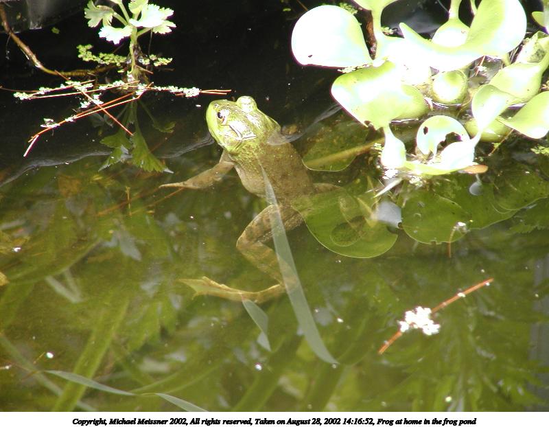 Picture #22: Frog at home in the frog pond #6 800x622, 76,794 bytes (75K), (html file) Copyright, Michael Meissner 2002, All rights reserved Olympus C-2100UZ camera f/2.8, ISO 100, 1/160 sec, 48.3mm, auto mode, SHQ, matrix metering, macro 35mm equivalent focal length 268.0mm Taken by Michael Meissner on August 28, 2002 14:15:21 Last modified on August 28, 2002 at 21:40 |