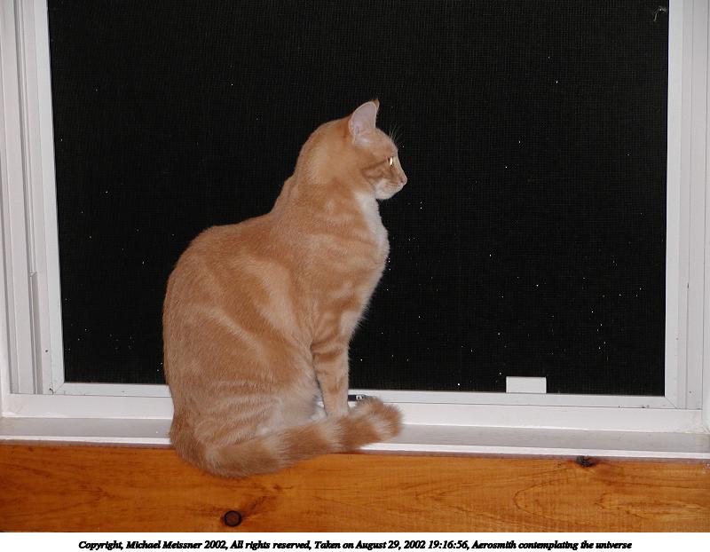 Picture #11: Aerosmith contemplating the universe 800x622, 61,283 bytes (60K), (html file) Copyright, Michael Meissner 2002, All rights reserved Olympus C-2100UZ camera f/2.8, ISO 100, flash, 1/100 sec, 22.3mm, auto mode, SHQ, matrix metering 35mm equivalent focal length 124.0mm Taken by Michael Meissner on August 29, 2002 19:16:56 Last modified on August 29, 2002 at 23:48 |