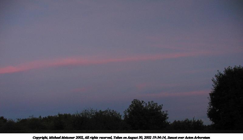 Picture #10: Sunset over Acton Arboretum 800x463, 28,742 bytes (29K), (html file) Copyright, Michael Meissner 2002, All rights reserved Olympus C-2100UZ camera f/2.8, ISO 100, 1/13 sec, 7.0mm, auto mode, SHQ, matrix metering, bias -2.0 35mm equivalent focal length 39.0mm Taken by Michael Meissner on August 30, 2002 19:33:47 Last modified on August 30, 2002 at 20:45 |