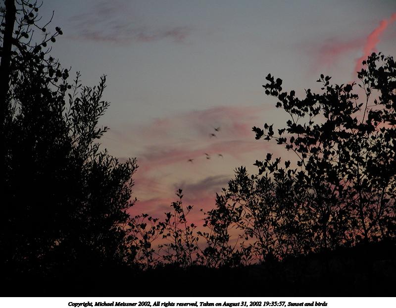 Picture #1: Sunset and birds 800x622, 87,815 bytes (86K), (html file) Copyright, Michael Meissner 2002, All rights reserved Olympus C-2100UZ camera f/2.8, ISO 100, 1/20 sec, 27.3mm, auto mode, SHQ, matrix metering, bias -1.0 35mm equivalent focal length 151.0mm Taken by Michael Meissner on August 31, 2002 19:35:57 Last modified on September 01, 2002 at 00:45 |