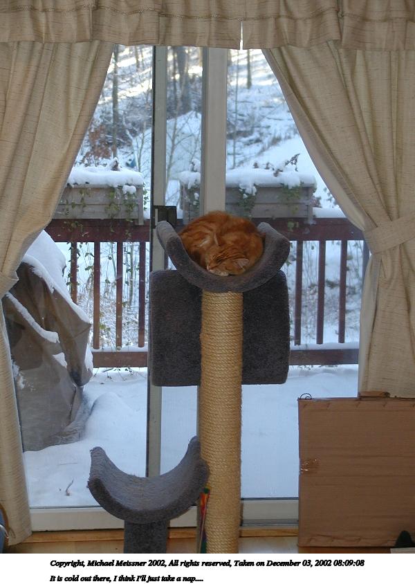 Picture #102: It is cold out there, I think I'll just take a nap.... #2 600x844, 83,895 bytes (82K), (html file) Copyright, Michael Meissner 2002, All rights reserved Olympus C-2100UZ camera f/2.8, ISO 100, flash, 1/80 sec, 19.3mm, auto mode, SHQ, cloudy, matrix metering 35mm equivalent focal length 107.0mm Taken by Michael Meissner on December 03, 2002 08:09:08 Last modified on December 04, 2002 at 07:21 |