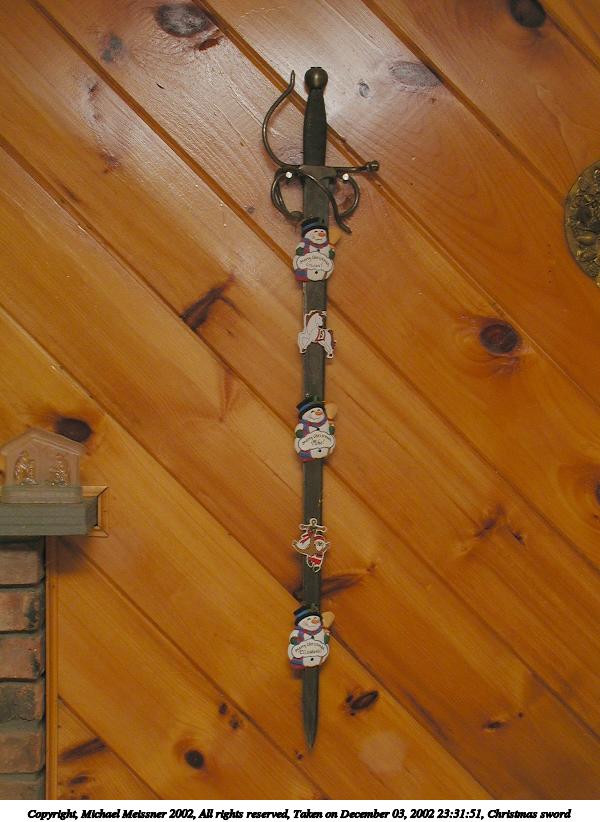 Picture #96: Christmas sword 600x822, 69,273 bytes (68K), (html file) Copyright, Michael Meissner 2002, All rights reserved Olympus C-2100UZ camera f/8.0, ISO 100, 1/60 sec, 13.4mm, aperture priority, SHQ, cloudy, matrix metering 35mm equivalent focal length 74.0mm Taken by Michael Meissner on December 03, 2002 23:31:51 Last modified on December 04, 2002 at 07:28 |