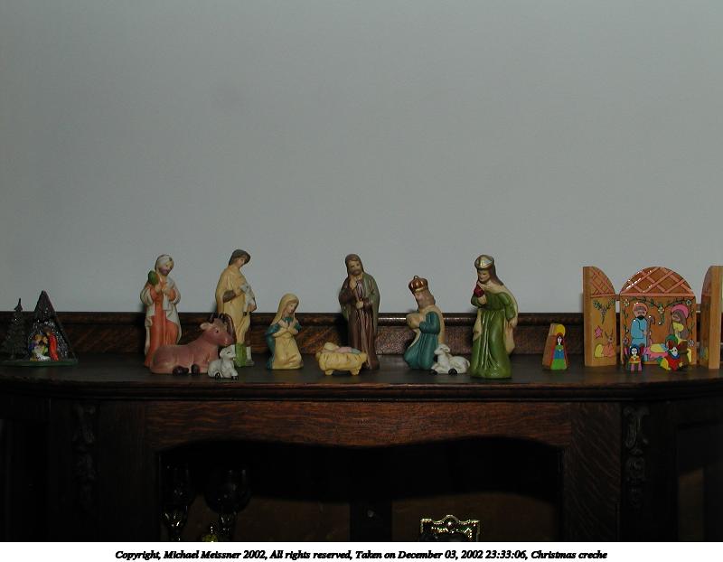 Picture #93: Christmas creche #2 800x622, 43,979 bytes (43K), (html file) Copyright, Michael Meissner 2002, All rights reserved Olympus C-2100UZ camera f/8.0, ISO 100, 1/40 sec, 9.0mm, aperture priority, SHQ, cloudy, matrix metering 35mm equivalent focal length 50.0mm Taken by Michael Meissner on December 03, 2002 23:33:06 Last modified on December 04, 2002 at 07:30 |