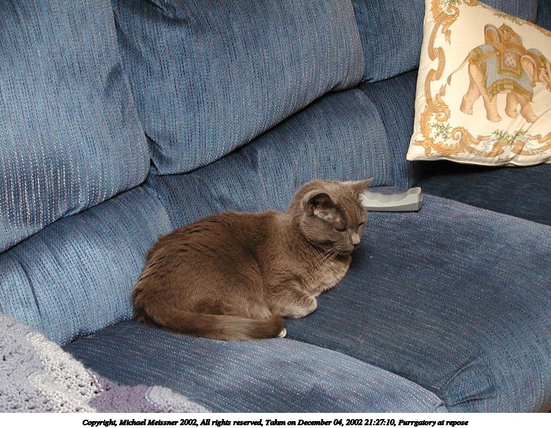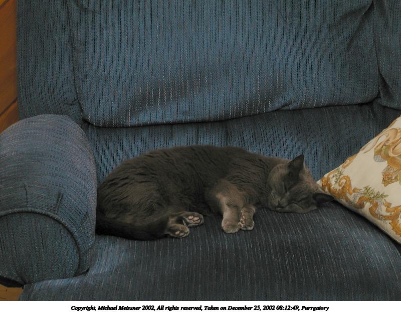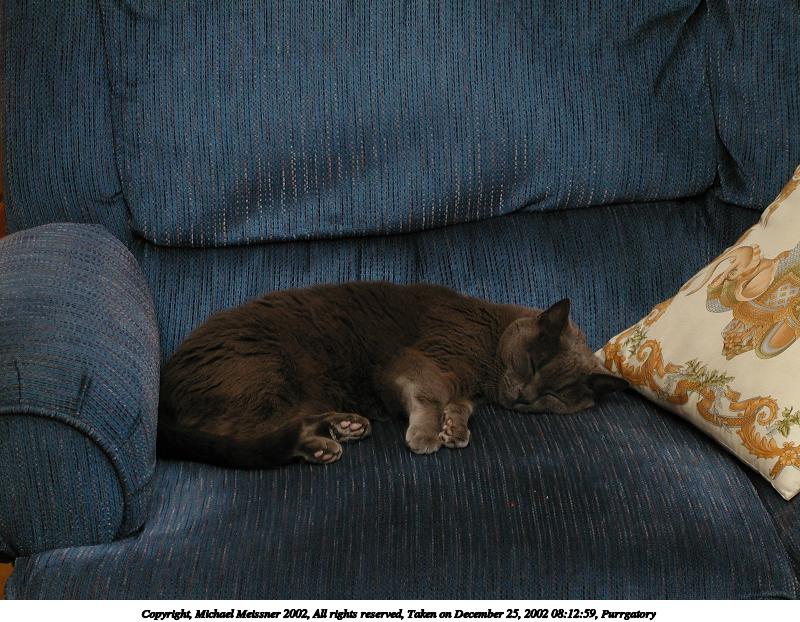 Picture #92: Purrgatory at repose 800x622, 137,899 bytes (135K), (html file) Copyright, Michael Meissner 2002, All rights reserved Olympus C-2100UZ camera f/2.8, ISO 100, 1/80 sec, 17.3mm, auto mode, SHQ, cloudy, matrix metering 35mm equivalent focal length 96.0mm Taken by Michael Meissner on December 04, 2002 21:27:10 Last modified on December 05, 2002 at 03:29 |