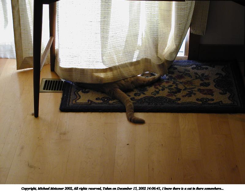Picture #88: I know there is a cat in there somewhere... 800x622, 70,094 bytes (69K), (html file) Copyright, Michael Meissner 2002, All rights reserved Olympus C-2100UZ camera f/2.8, ISO 100, 1/60 sec, 15.2mm, auto mode, SHQ, matrix metering 35mm equivalent focal length 84.0mm Taken by Michael Meissner on December 15, 2002 14:06:41 Last modified on December 16, 2002 at 07:53 |