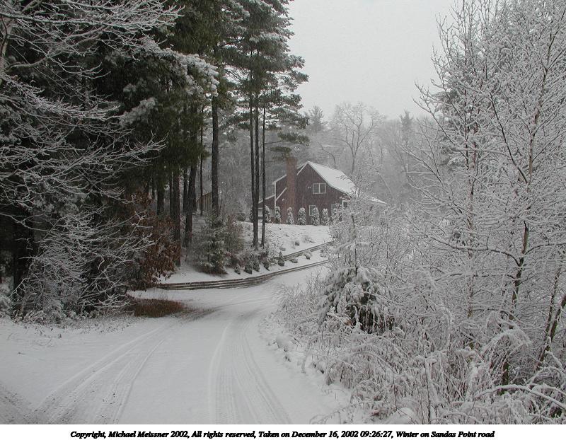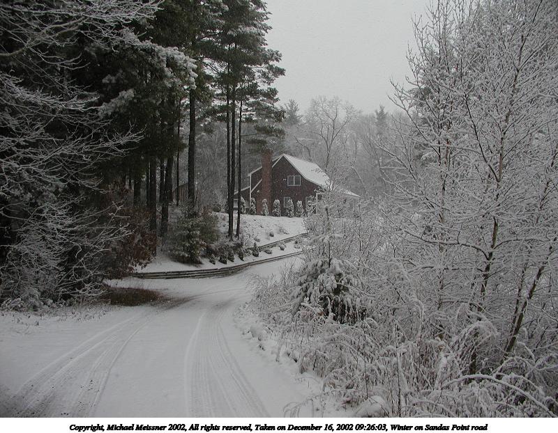 Picture #87: Winter on Sandas Point road 800x622, 133,075 bytes (130K), (html file) Copyright, Michael Meissner 2002, All rights reserved Olympus C-2100UZ camera f/2.8, ISO 100, 1/400 sec, 7.0mm, auto mode, SHQ, matrix metering 35mm equivalent focal length 39.0mm Taken by Michael Meissner on December 16, 2002 09:26:03 Last modified on December 16, 2002 at 20:45 |