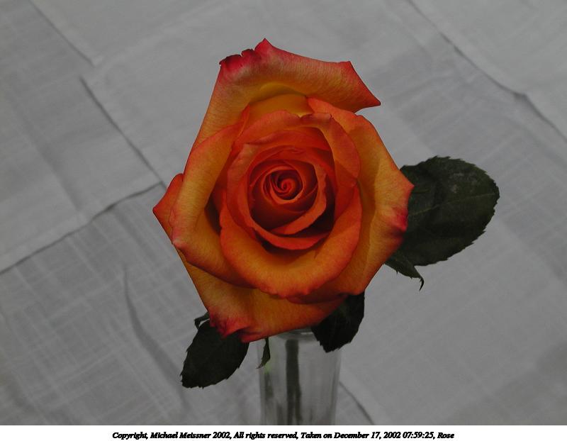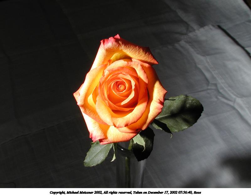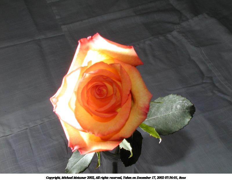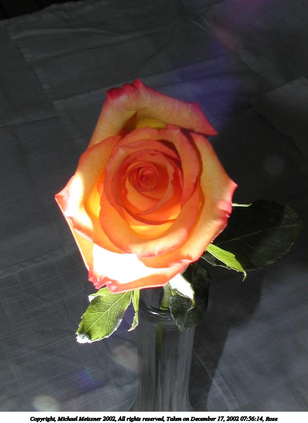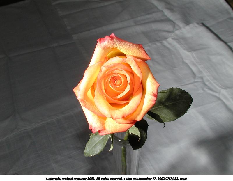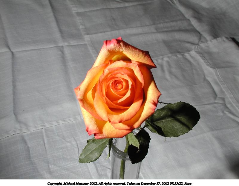 Picture #78: Rose #3 800x622, 48,814 bytes (48K), (html file) Copyright, Michael Meissner 2002, All rights reserved Olympus C-2100UZ camera f/8.0, ISO 100, 1/125 sec, 12.0mm, manual mode, SHQ, matrix metering 35mm equivalent focal length 67.0mm Taken by Michael Meissner on December 17, 2002 07:55:52 Last modified on December 17, 2002 at 08:13 Shutter speed of 1/125 or 1/250 may indicate use of flash |