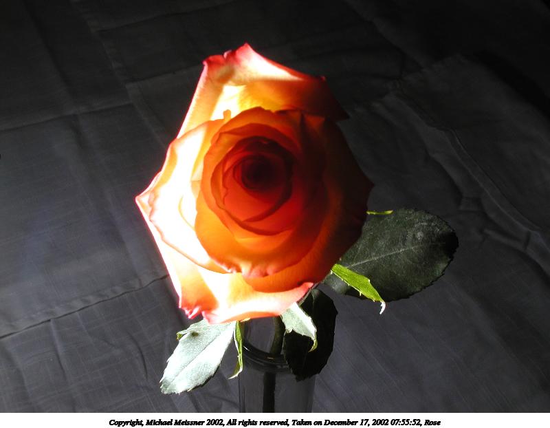 Picture #74: Rose #7 800x622, 50,553 bytes (50K), (html file) Copyright, Michael Meissner 2002, All rights reserved Olympus C-2100UZ camera f/8.0, ISO 100, 1/125 sec, 10.5mm, manual mode, SHQ, matrix metering, macro 35mm equivalent focal length 58.0mm Taken by Michael Meissner on December 17, 2002 07:56:40 Last modified on December 17, 2002 at 08:14 Shutter speed of 1/125 or 1/250 may indicate use of flash |