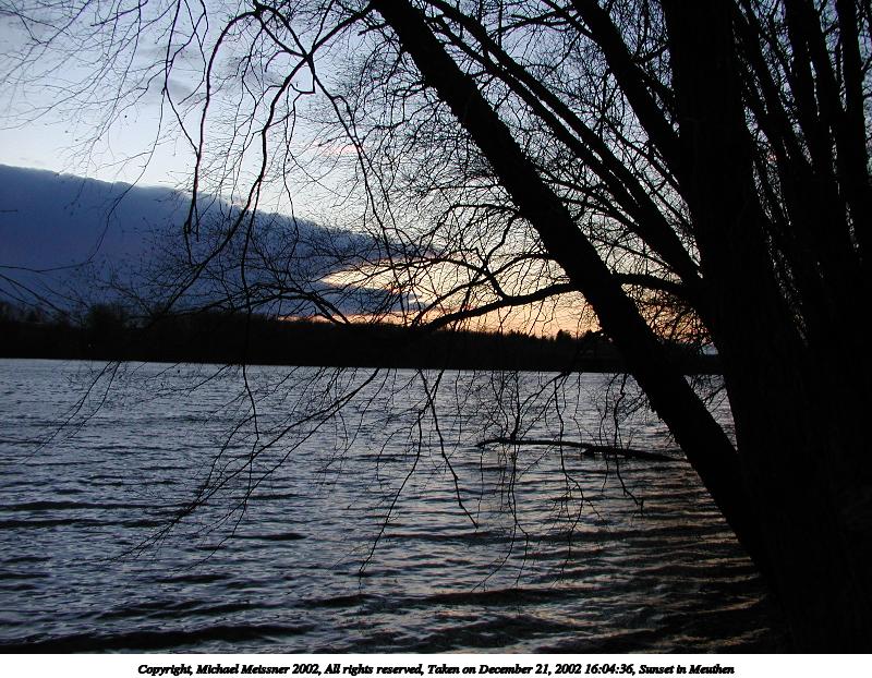 Picture #65: Sunset in Meuthen #5 600x822, 79,190 bytes (78K), (html file) Copyright, Michael Meissner 2002, All rights reserved Olympus C-2100UZ camera f/2.8, ISO 100, 1/125 sec, 15.7mm, auto mode, SHQ, matrix metering 35mm equivalent focal length 87.0mm Taken by Michael Meissner on December 21, 2002 16:06:07 Last modified on December 22, 2002 at 07:41 Shutter speed of 1/125 or 1/250 may indicate use of flash |