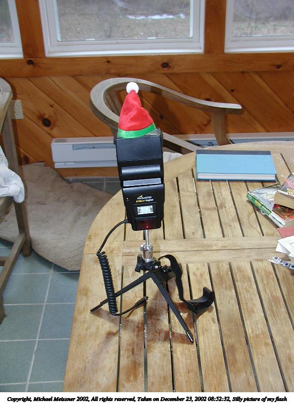 Picture #64: Silly picture of my flash 600x822, 87,528 bytes (86K), (html file) Copyright, Michael Meissner 2002, All rights reserved Olympus C-2100UZ camera f/2.8, ISO 100, flash, 1/40 sec, 8.2mm, auto mode, SHQ, matrix metering 35mm equivalent focal length 46.0mm Taken by Michael Meissner on December 23, 2002 08:52:32 Last modified on December 23, 2002 at 09:05 |