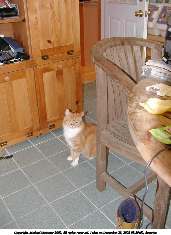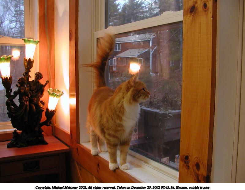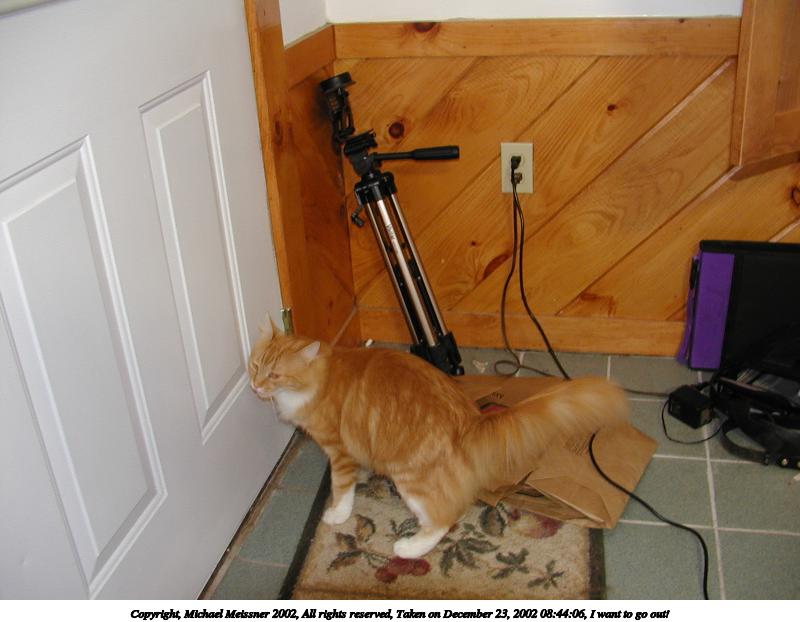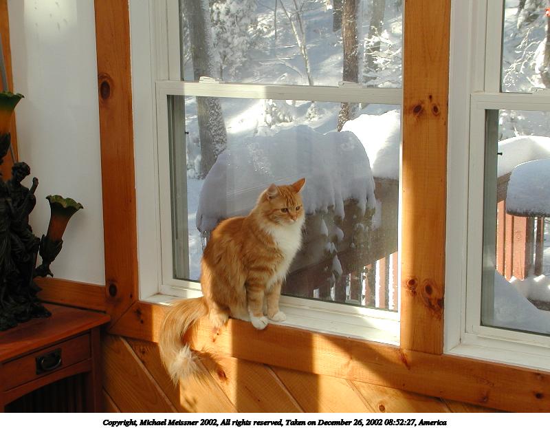 Picture #54: I want to go out! 800x622, 60,327 bytes (59K), (html file) Copyright, Michael Meissner 2002, All rights reserved Olympus C-2100UZ camera f/2.8, ISO 100, flash, 1/30 sec, 7.0mm, auto mode, SHQ, matrix metering 35mm equivalent focal length 39.0mm Taken by Michael Meissner on December 23, 2002 08:44:06 Last modified on December 24, 2002 at 13:43 |