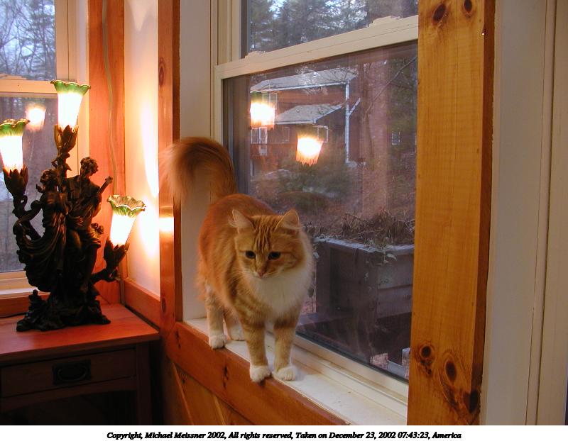 Picture #48: Purrgatory #2 800x622, 105,309 bytes (103K), (html file) Copyright, Michael Meissner 2002, All rights reserved Olympus C-2100UZ camera f/5.6, ISO 100, 1/100 sec, 21.5mm, aperture priority, SHQ, cloudy, matrix metering 35mm equivalent focal length 119.0mm Taken by Michael Meissner on December 25, 2002 08:12:59 Last modified on December 25, 2002 at 18:56 |