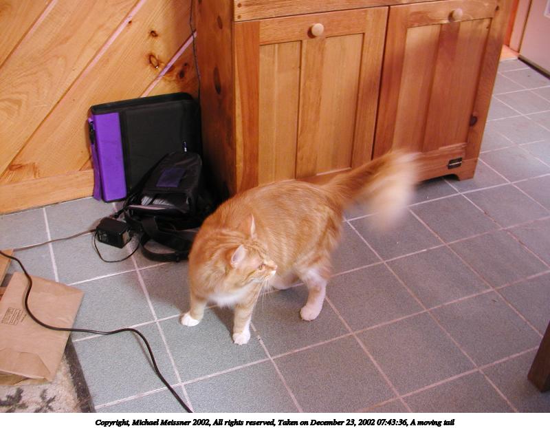 Picture #57: A moving tail 800x622, 74,247 bytes (73K), (html file) Copyright, Michael Meissner 2002, All rights reserved Olympus C-2100UZ camera f/2.8, ISO 100, 1/5 sec, 7.0mm, auto mode, SHQ, matrix metering 35mm equivalent focal length 39.0mm Taken by Michael Meissner on December 23, 2002 07:43:36 Last modified on December 24, 2002 at 13:41 |