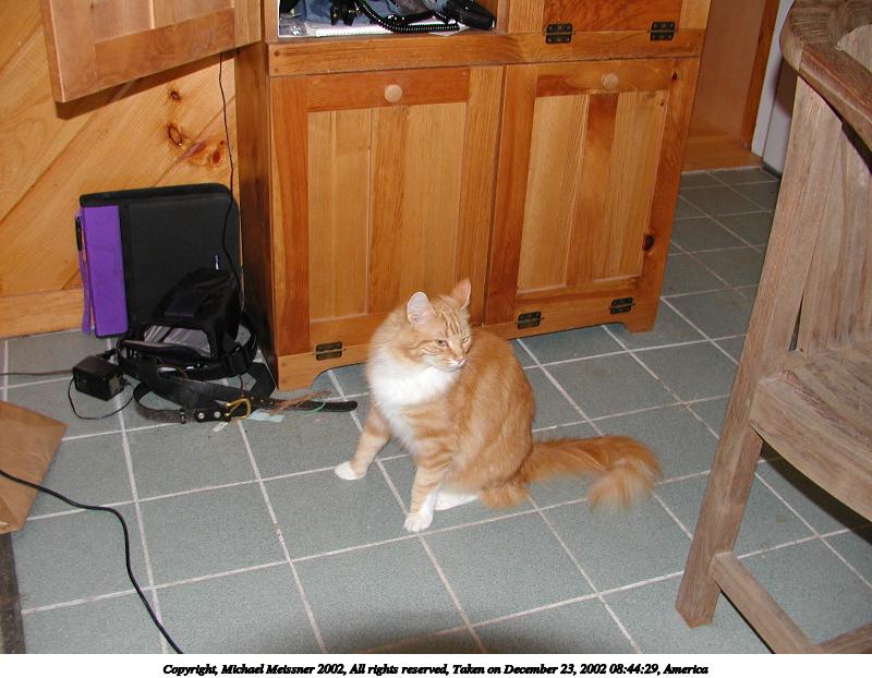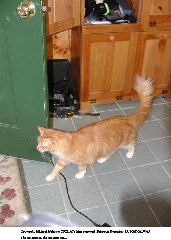 Picture #55: The cat goes in, the cat goes out.... 600x844, 66,009 bytes (65K), (html file) Copyright, Michael Meissner 2002, All rights reserved Olympus C-2100UZ camera f/2.8, ISO 100, flash, 1/30 sec, 7.0mm, auto mode, SHQ, matrix metering 35mm equivalent focal length 39.0mm Taken by Michael Meissner on December 23, 2002 08:39:45 Last modified on December 24, 2002 at 13:42 |