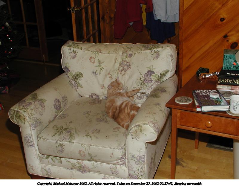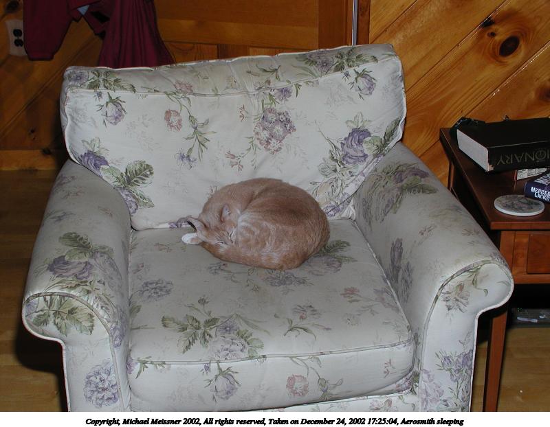 Picture #52: Aerosmith sleeping 800x622, 78,295 bytes (77K), (html file) Copyright, Michael Meissner 2002, All rights reserved Olympus C-2100UZ camera f/8.0, ISO 100, 1/125 sec, 11.6mm, manual mode, SHQ, matrix metering 35mm equivalent focal length 64.0mm Taken by Michael Meissner on December 24, 2002 17:25:04 Last modified on December 25, 2002 at 18:35 Shutter speed of 1/125 or 1/250 may indicate use of flash |