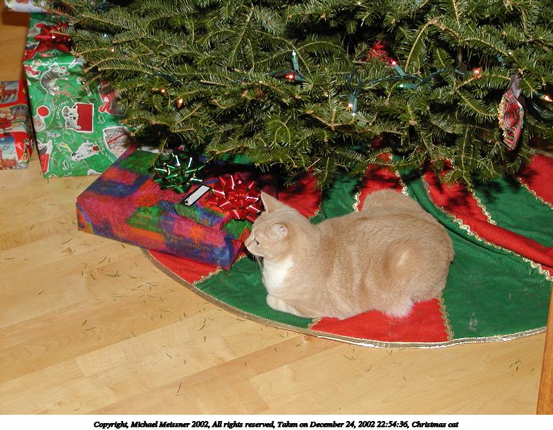 Picture #51: Christmas cat 800x622, 127,762 bytes (125K), (html file) Copyright, Michael Meissner 2002, All rights reserved Olympus C-2100UZ camera f/2.8, ISO 100, 1/60 sec, 14.3mm, auto mode, SHQ, cloudy, matrix metering 35mm equivalent focal length 79.0mm Taken by Michael Meissner on December 24, 2002 22:54:36 Last modified on December 25, 2002 at 18:40 |