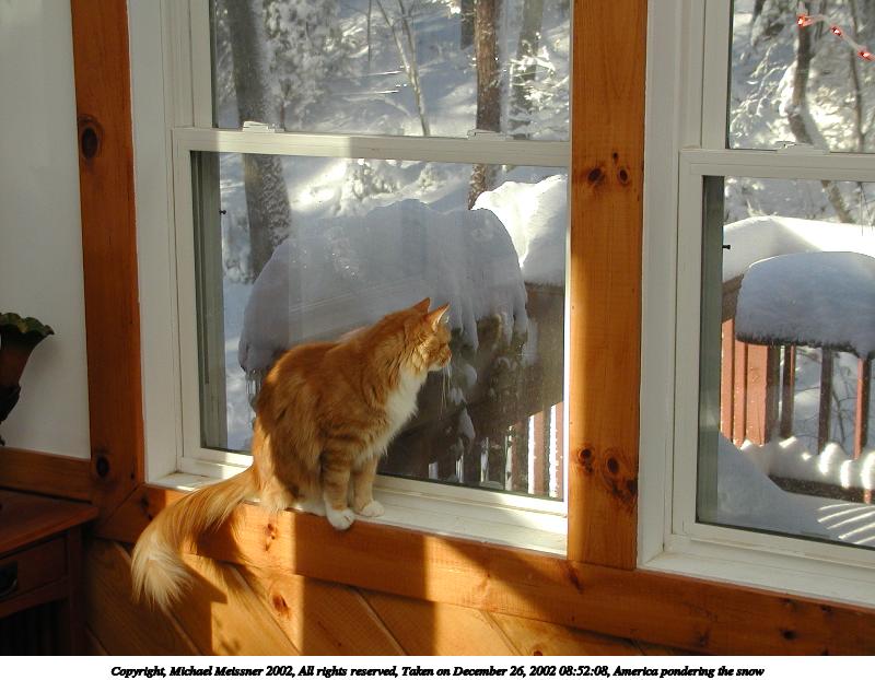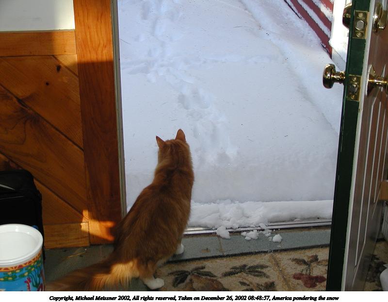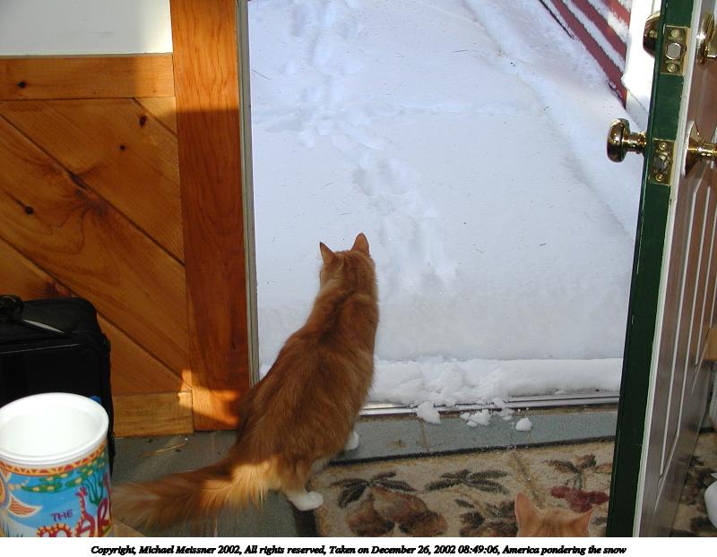 Picture #44: America pondering the snow #2 800x622, 69,780 bytes (69K), (html file) Copyright, Michael Meissner 2002, All rights reserved Olympus C-2100UZ camera f/2.8, ISO 100, 1/200 sec, 12.3mm, auto mode, SHQ, cloudy, matrix metering 35mm equivalent focal length 68.0mm Taken by Michael Meissner on December 26, 2002 08:49:06 Last modified on December 26, 2002 at 09:18 |