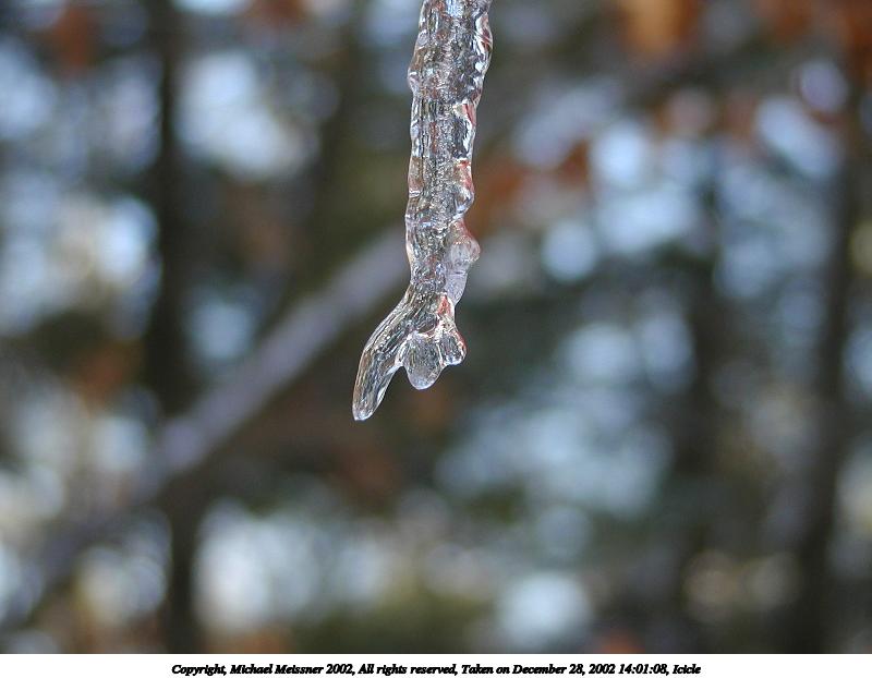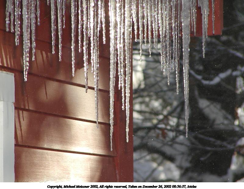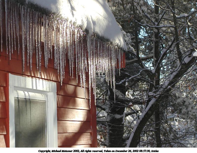 Picture #25: Icicle #3 800x622, 50,076 bytes (49K), (html file) Copyright, Michael Meissner 2002, All rights reserved Olympus C-2100UZ camera f/2.8, ISO 100, 1/250 sec, 26.2mm, auto mode, SHQ, cloudy, matrix metering, macro 35mm equivalent focal length 145.0mm Taken by Michael Meissner on December 28, 2002 14:01:20 Last modified on December 29, 2002 at 20:04 Shutter speed of 1/125 or 1/250 may indicate use of flash |