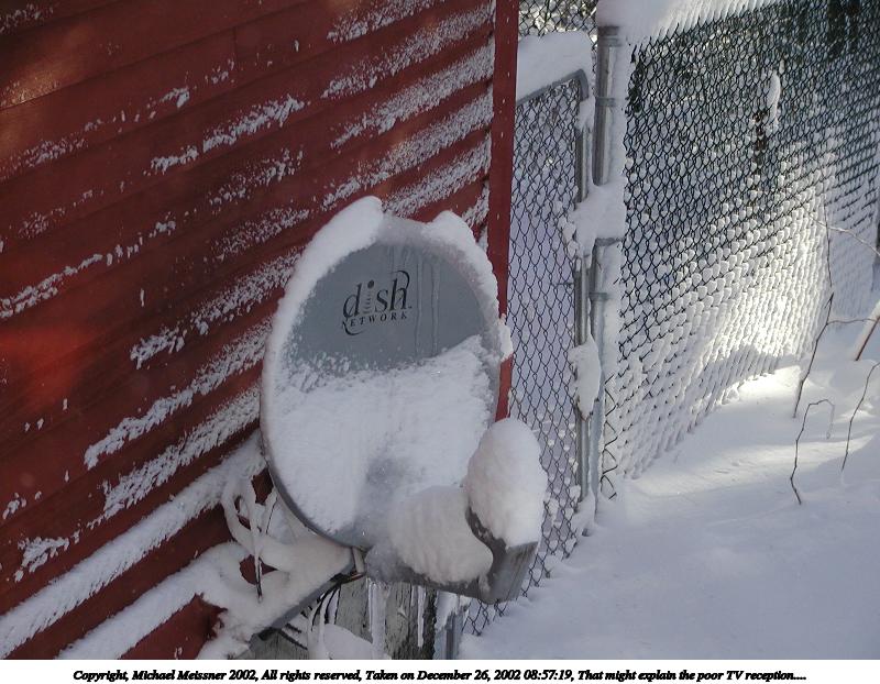 Picture #39: That might explain the poor TV reception.... 800x622, 102,889 bytes (101K), (html file) Copyright, Michael Meissner 2002, All rights reserved Olympus C-2100UZ camera f/2.8, ISO 100, 1/400 sec, 20.0mm, auto mode, SHQ, cloudy, matrix metering 35mm equivalent focal length 111.0mm Taken by Michael Meissner on December 26, 2002 08:57:19 Last modified on December 26, 2002 at 09:28 |