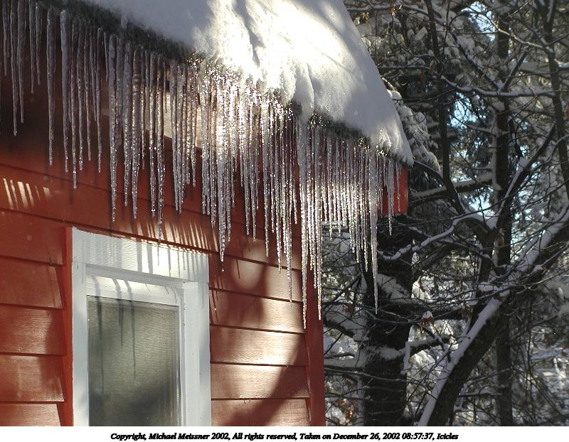Picture #15: Icicle #13 600x822, 66,721 bytes (66K), (html file) Copyright, Michael Meissner 2002, All rights reserved Olympus C-2100UZ camera f/8.0, ISO 100, 1/125 sec, 20.0mm, manual mode, SHQ, cloudy, matrix metering, macro 35mm equivalent focal length 111.0mm Taken by Michael Meissner on December 28, 2002 14:03:20 Last modified on December 29, 2002 at 20:10 Shutter speed of 1/125 or 1/250 may indicate use of flash |