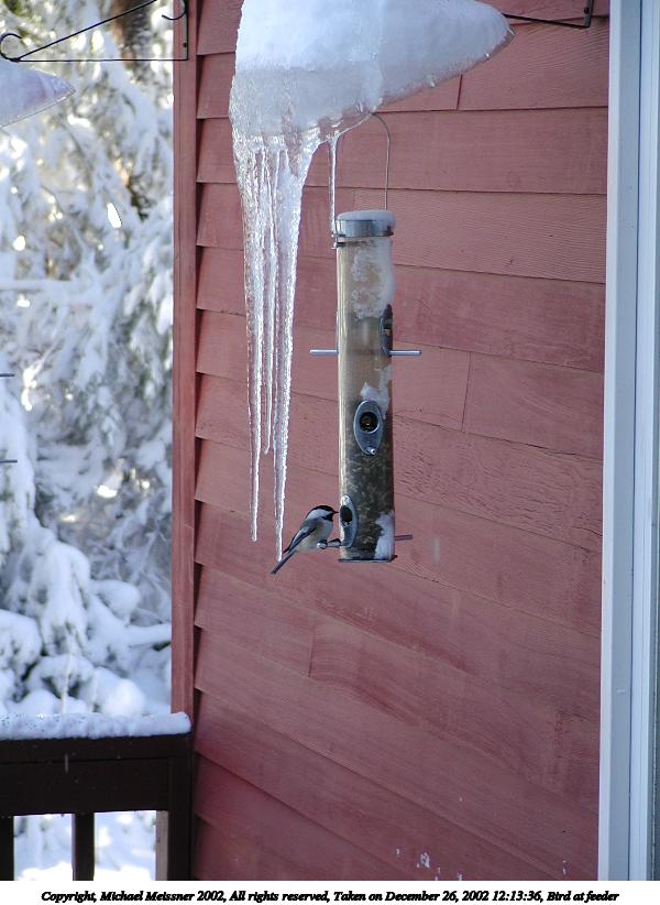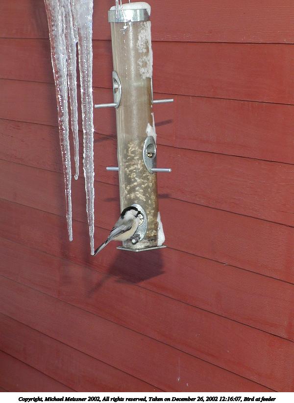 Picture #35: Bird at feeder #2 600x822, 66,358 bytes (65K), (html file) Copyright, Michael Meissner 2002, All rights reserved Olympus C-2100UZ camera f/5.6, ISO 100, 1/125 sec, 27.3mm, aperture priority, SHQ, cloudy, matrix metering 35mm equivalent focal length 151.0mm Taken by Michael Meissner on December 26, 2002 12:16:07 Last modified on December 29, 2002 at 19:53 Shutter speed of 1/125 or 1/250 may indicate use of flash |