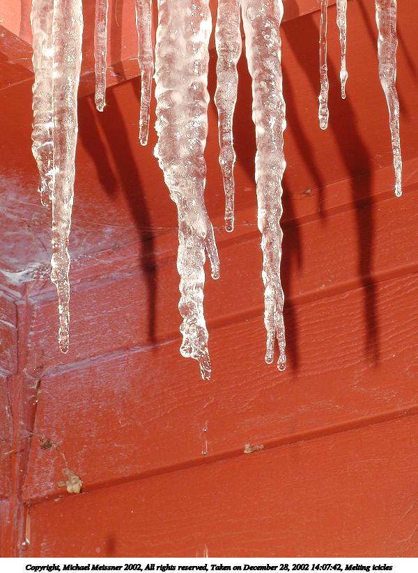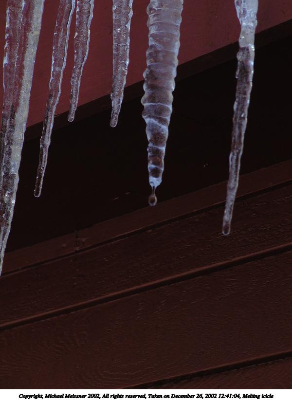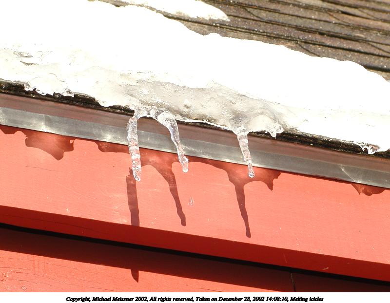 Picture #13: Melting icicles #2 800x622, 69,709 bytes (69K), (html file) Copyright, Michael Meissner 2002, All rights reserved Olympus C-2100UZ camera f/8.0, ISO 100, 1/125 sec, 25.2mm, manual mode, SHQ, cloudy, matrix metering 35mm equivalent focal length 140.0mm Taken by Michael Meissner on December 28, 2002 14:08:10 Last modified on December 29, 2002 at 20:12 Shutter speed of 1/125 or 1/250 may indicate use of flash |