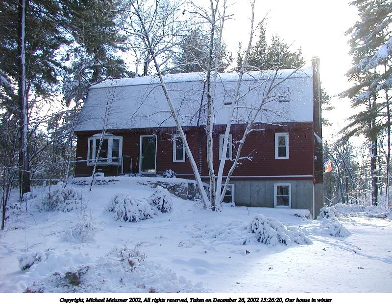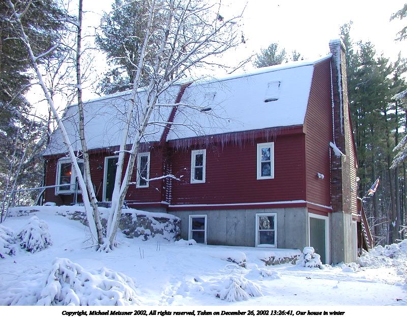 Picture #29: Our house in winter #3 800x622, 139,896 bytes (137K), (html file) Copyright, Michael Meissner 2002, All rights reserved Olympus C-2100UZ camera f/2.8, ISO 100, 1/200 sec, 7.0mm, auto mode, SHQ, cloudy, spot metering 35mm equivalent focal length 39.0mm Taken by Michael Meissner on December 26, 2002 13:27:05 Last modified on December 29, 2002 at 20:02 |
