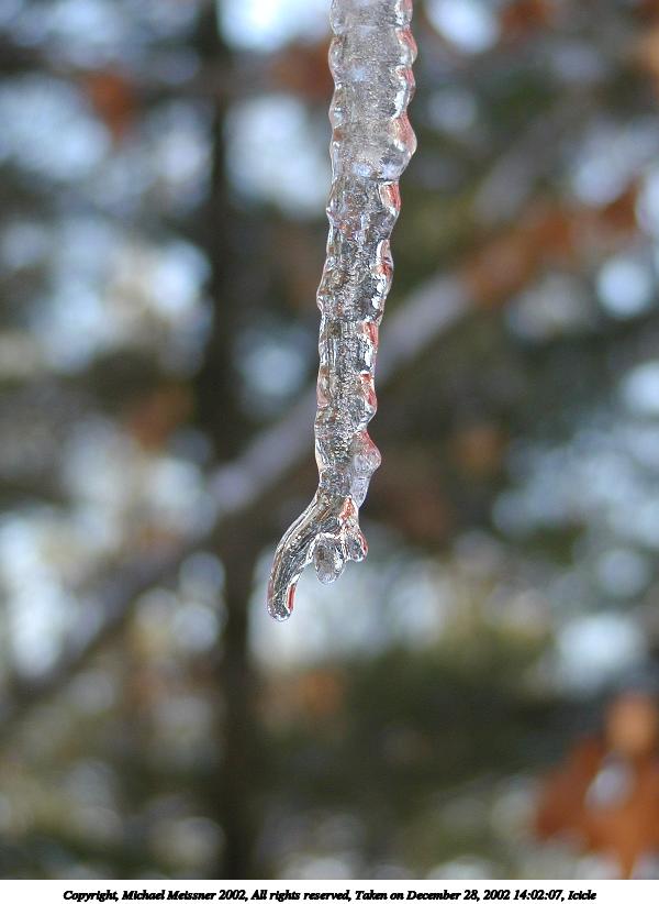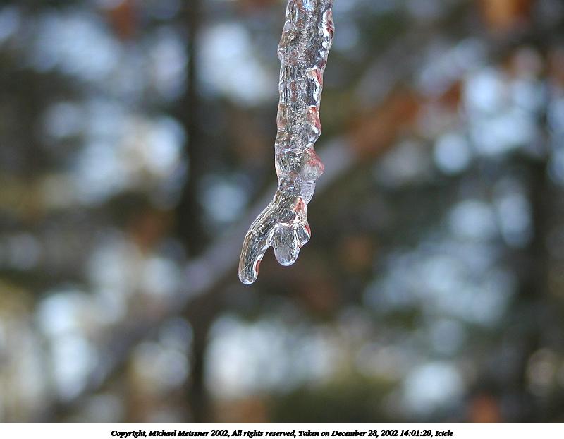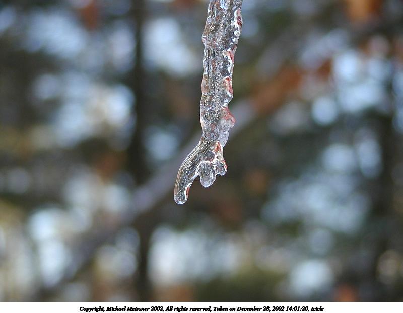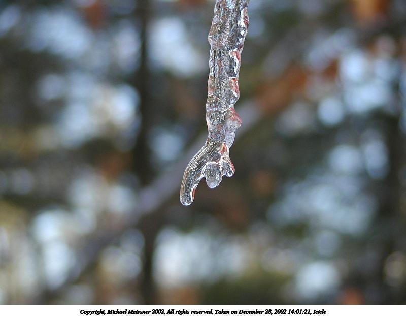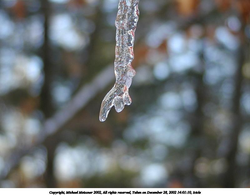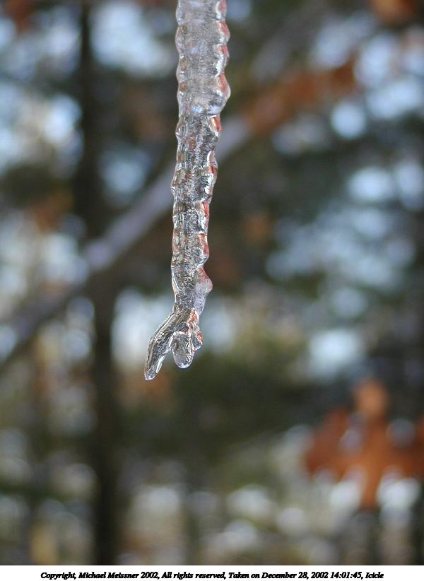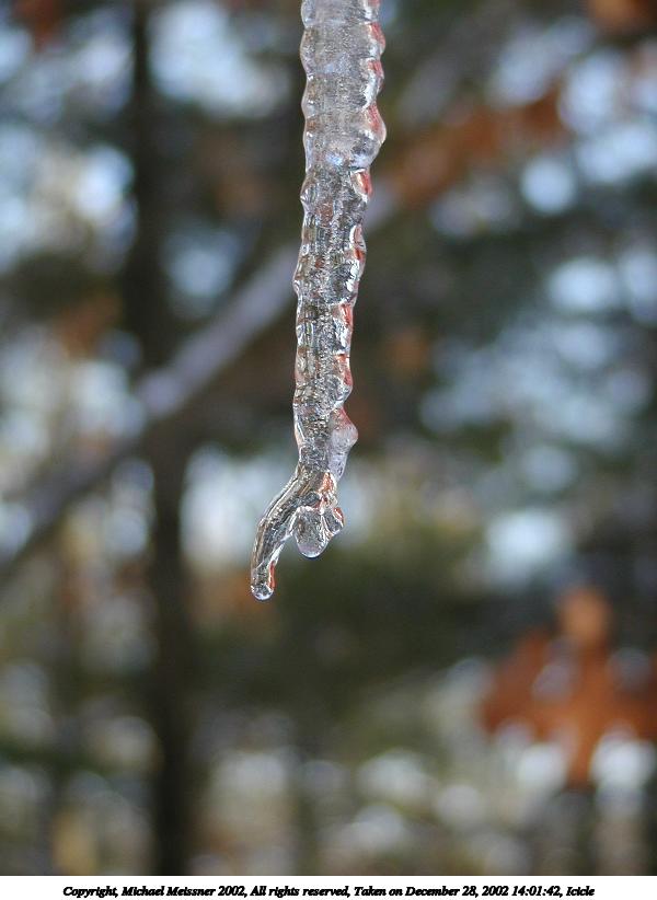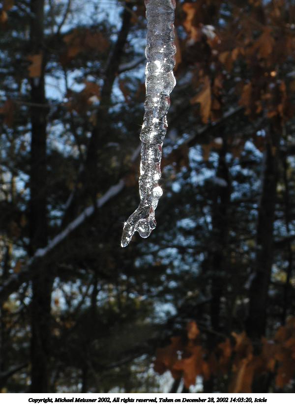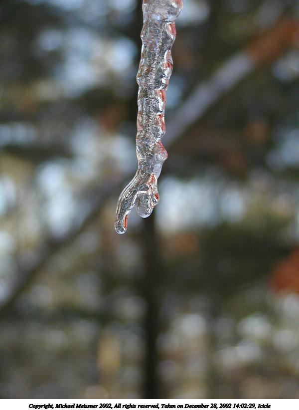 Picture #20: Icicle #8 600x822, 50,896 bytes (50K), (html file) Copyright, Michael Meissner 2002, All rights reserved Olympus C-2100UZ camera f/2.8, ISO 100, 1/250 sec, 26.2mm, auto mode, SHQ, cloudy, matrix metering, macro 35mm equivalent focal length 145.0mm Taken by Michael Meissner on December 28, 2002 14:01:45 Last modified on December 29, 2002 at 20:07 Shutter speed of 1/125 or 1/250 may indicate use of flash |