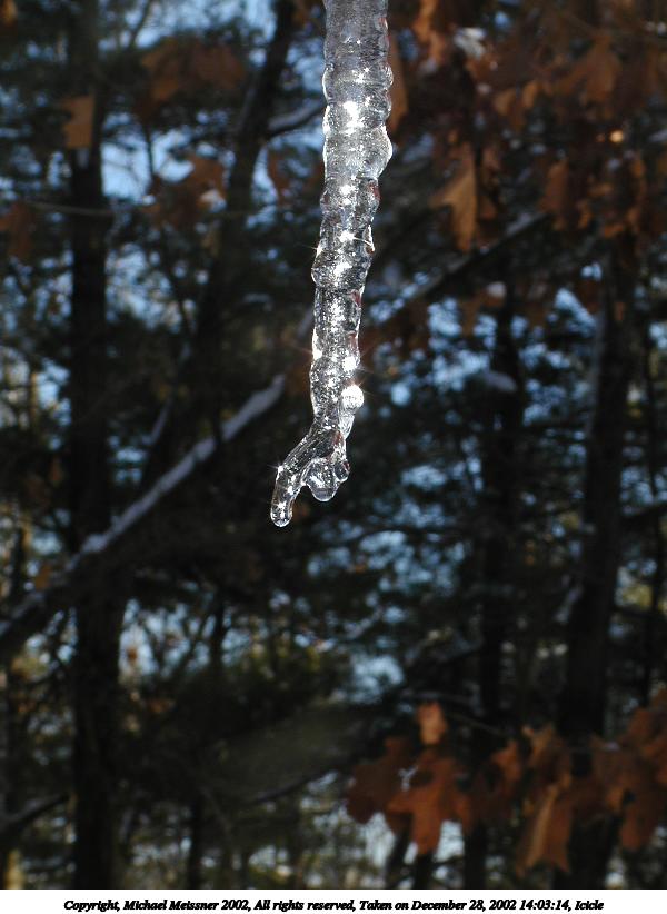 Picture #19: Icicle #9 600x822, 53,602 bytes (53K), (html file) Copyright, Michael Meissner 2002, All rights reserved Olympus C-2100UZ camera f/2.8, ISO 100, 1/250 sec, 26.2mm, auto mode, SHQ, cloudy, matrix metering, macro 35mm equivalent focal length 145.0mm Taken by Michael Meissner on December 28, 2002 14:02:07 Last modified on December 29, 2002 at 20:08 Shutter speed of 1/125 or 1/250 may indicate use of flash |