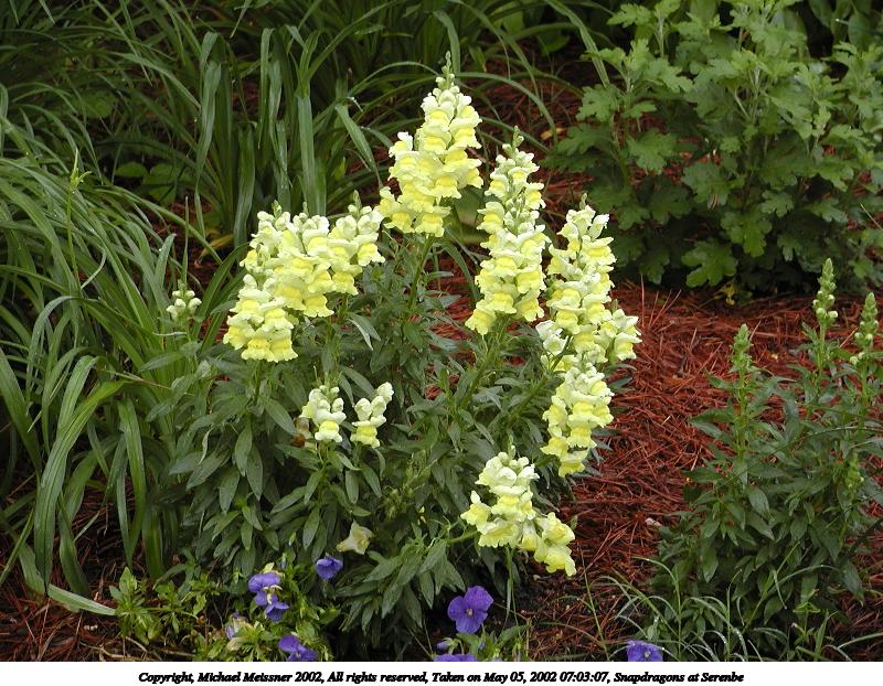Picture #35: Snapdragons at Serenbe 800x622, 136,989 bytes (134K), (html file) Copyright, Michael Meissner 2002, All rights reserved Olympus C-2100UZ camera f/2.8, ISO 100, 1/80 sec, 25.2mm, auto mode, SHQ, matrix metering 35mm equivalent focal length 140.0mm Taken by Michael Meissner on May 05, 2002 07:03:07 Last modified on May 29, 2002 at 21:31 |