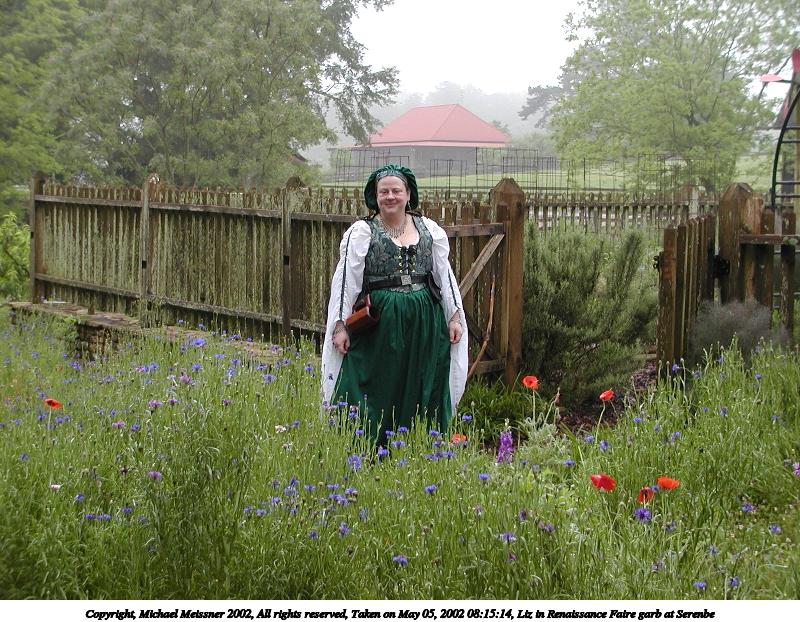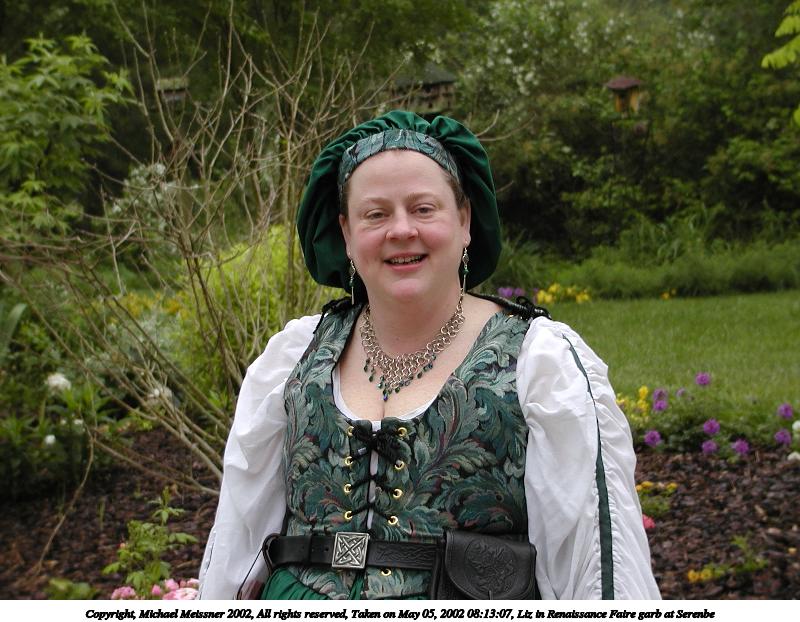 Picture #4: Liz in Renaissance Faire garb at Serenbe 800x622, 100,882 bytes (99K), (html file) Copyright, Michael Meissner 2002, All rights reserved Olympus C-2100UZ camera f/2.8, ISO 100, 1/200 sec, 16.8mm, auto mode, SHQ, matrix metering 35mm equivalent focal length 93.0mm Taken by Michael Meissner on May 05, 2002 08:13:07 Last modified on June 02, 2002 at 21:47 |