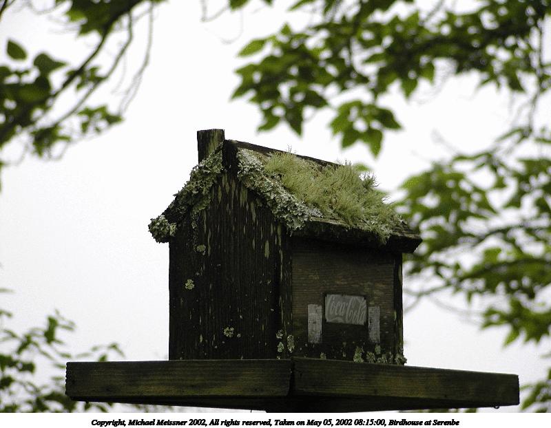 Picture #33: Birdhouse at Serenbe 800x622, 77,034 bytes (76K), (html file) Copyright, Michael Meissner 2002, All rights reserved Olympus C-2100UZ camera f/2.8, ISO 100, 1/250 sec, 28.5mm, auto mode, SHQ, matrix metering 35mm equivalent focal length 158.0mm Taken by Michael Meissner on May 05, 2002 08:15:00 Last modified on May 29, 2002 at 21:31 Shutter speed of 1/125 or 1/250 may indicate use of flash |