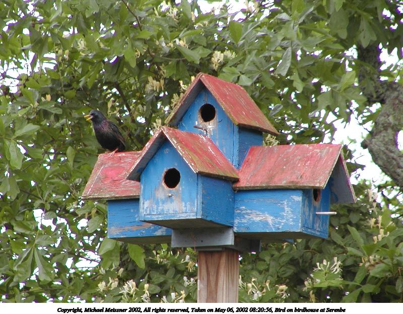 Picture #11: Bird on birdhouse at Serenbe 800x622, 121,791 bytes (119K), (html file) Copyright, Michael Meissner 2002, All rights reserved Olympus C-2100UZ camera f/3.5, ISO 100, 1/60 sec, 70.0mm, auto mode, SHQ, matrix metering 35mm equivalent focal length 388.0mm Taken by Michael Meissner on May 06, 2002 08:20:56 Last modified on May 29, 2002 at 21:31 |