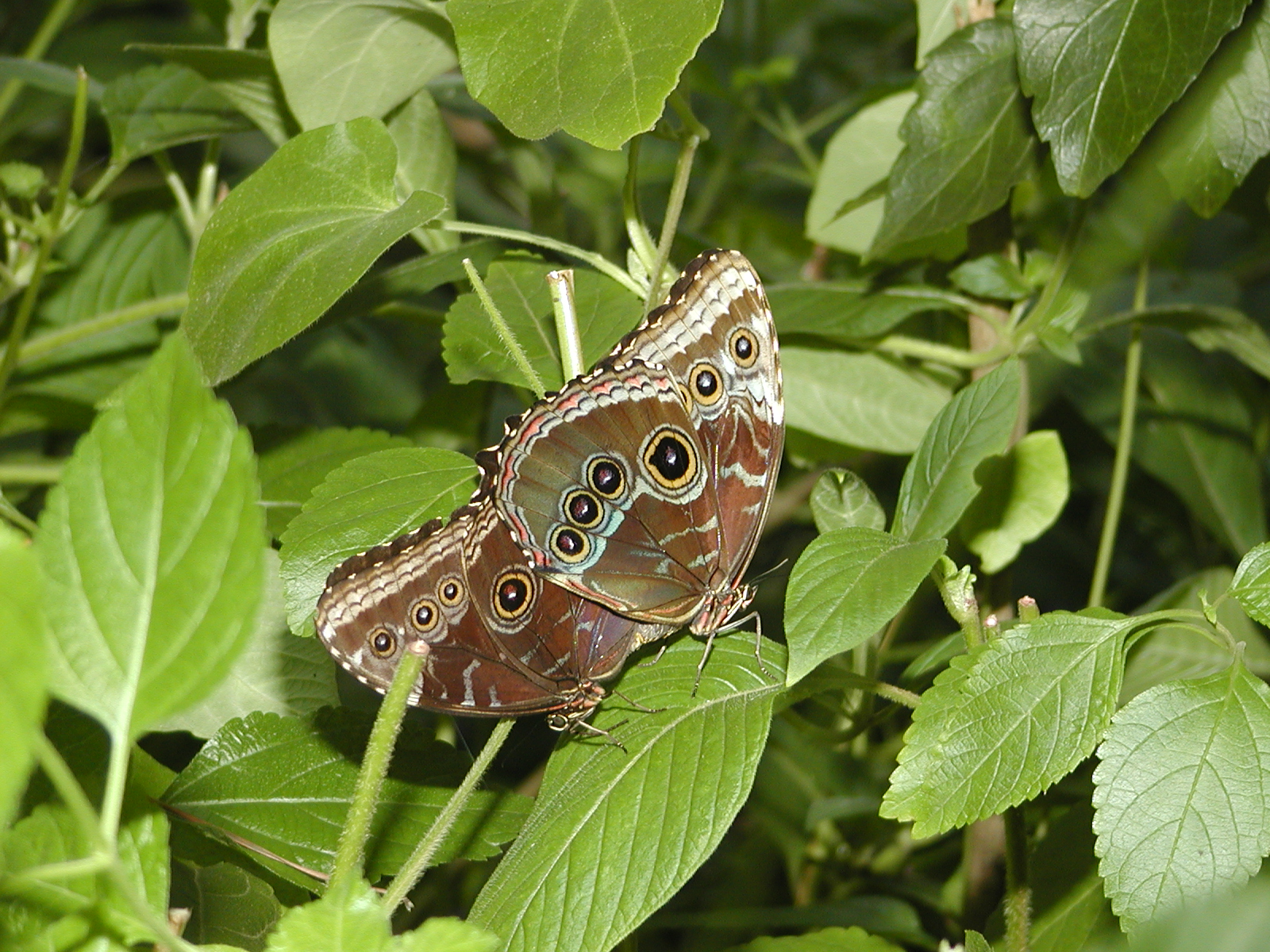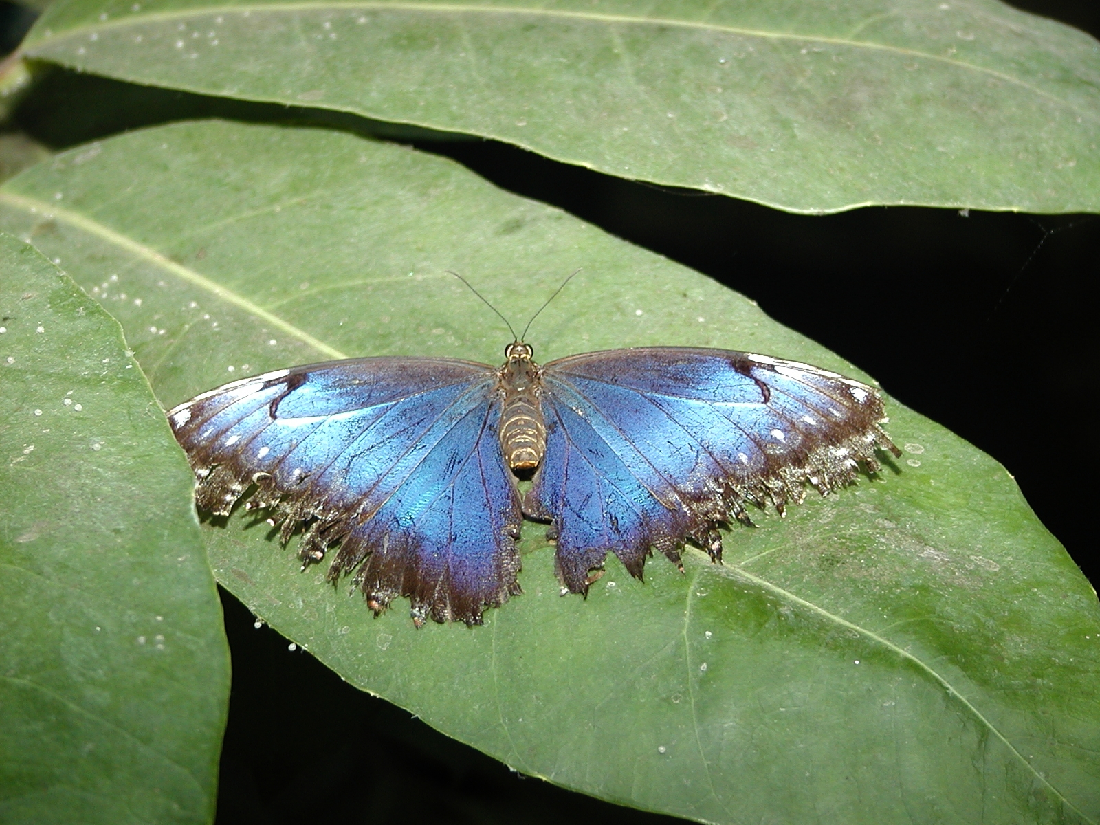Picture #8: Common Blue Morpho #2 Thumb: 400x300, 22,583 bytes (23K) Small: 800x623, 63,242 bytes (62K), (html file) Large: 800x600, 337,080 bytes (330K), (html file) Copyright, Michael Meissner 2003, All rights reserved Olympus C-2100UZ camera f/2.8, ISO 100, 1/250 sec, 29.8mm, shutter priority, SHQ, cloudy, matrix metering 35mm equivalent focal length 165.0mm Taken by Michael Meissner on September 20, 2003 14:23:12 Last modified on September 20, 2003 at 22:27 Shutter speed of 1/125 or 1/250 may indicate use of flash |