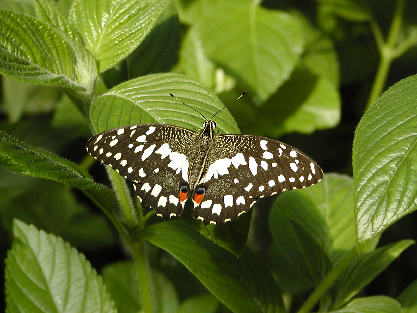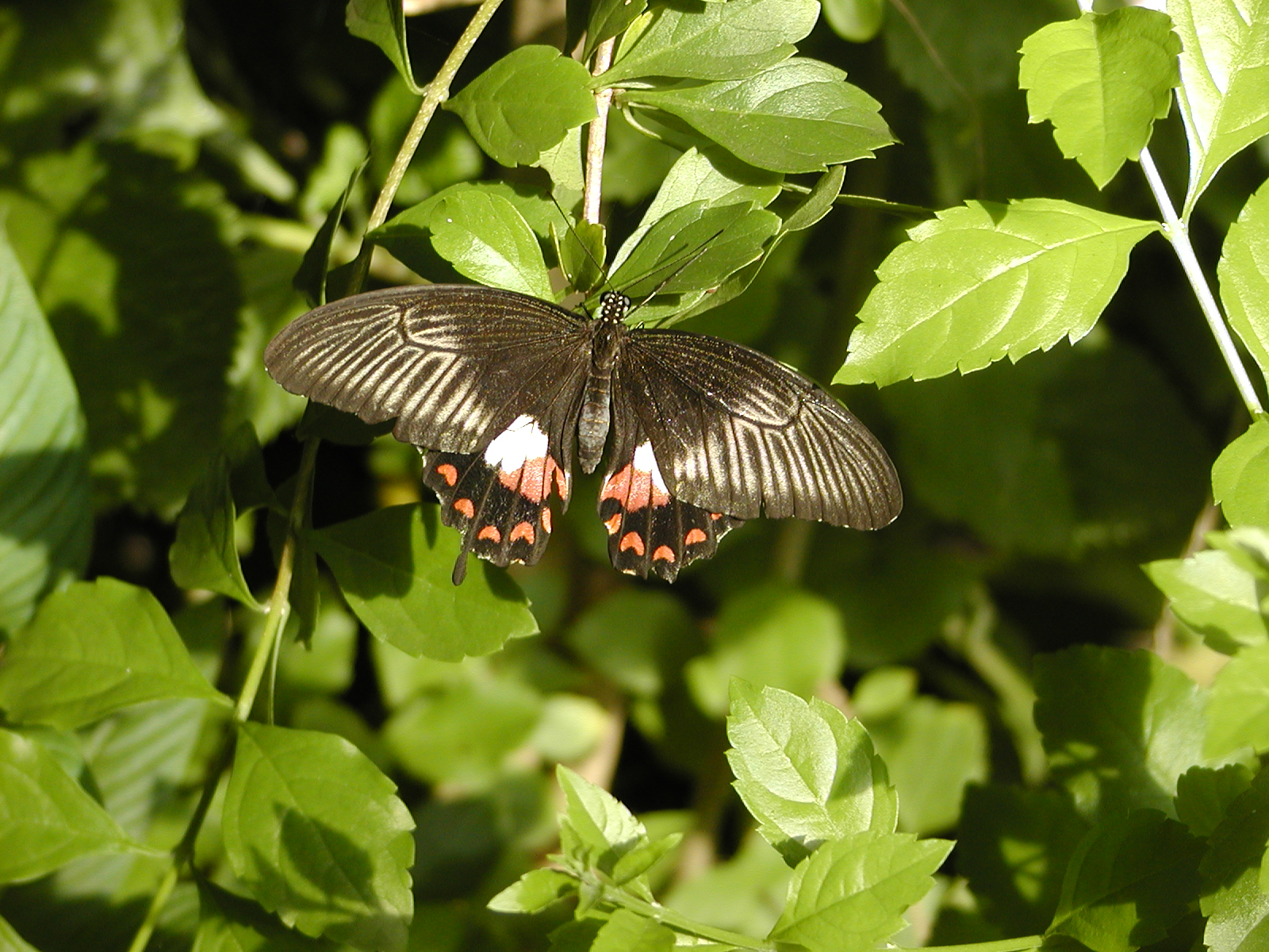 Picture #26: Butterfly #7 Thumb: 400x300, 24,691 bytes (25K) Small: 800x623, 68,811 bytes (68K), (html file) Large: 800x600, 353,303 bytes (346K), (html file) Copyright, Michael Meissner 2003, All rights reserved Olympus C-2100UZ camera f/2.8, ISO 100, 1/250 sec, 19.3mm, shutter priority, SHQ, cloudy, matrix metering 35mm equivalent focal length 107.0mm Taken by Michael Meissner on September 20, 2003 14:39:29 Last modified on September 24, 2003 at 10:08 Shutter speed of 1/125 or 1/250 may indicate use of flash |