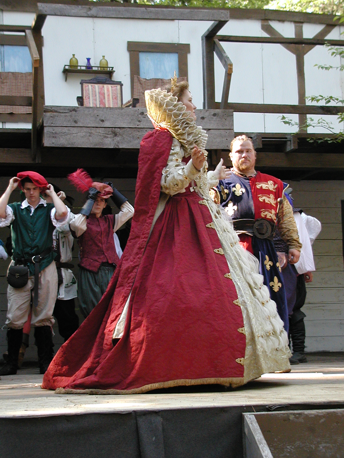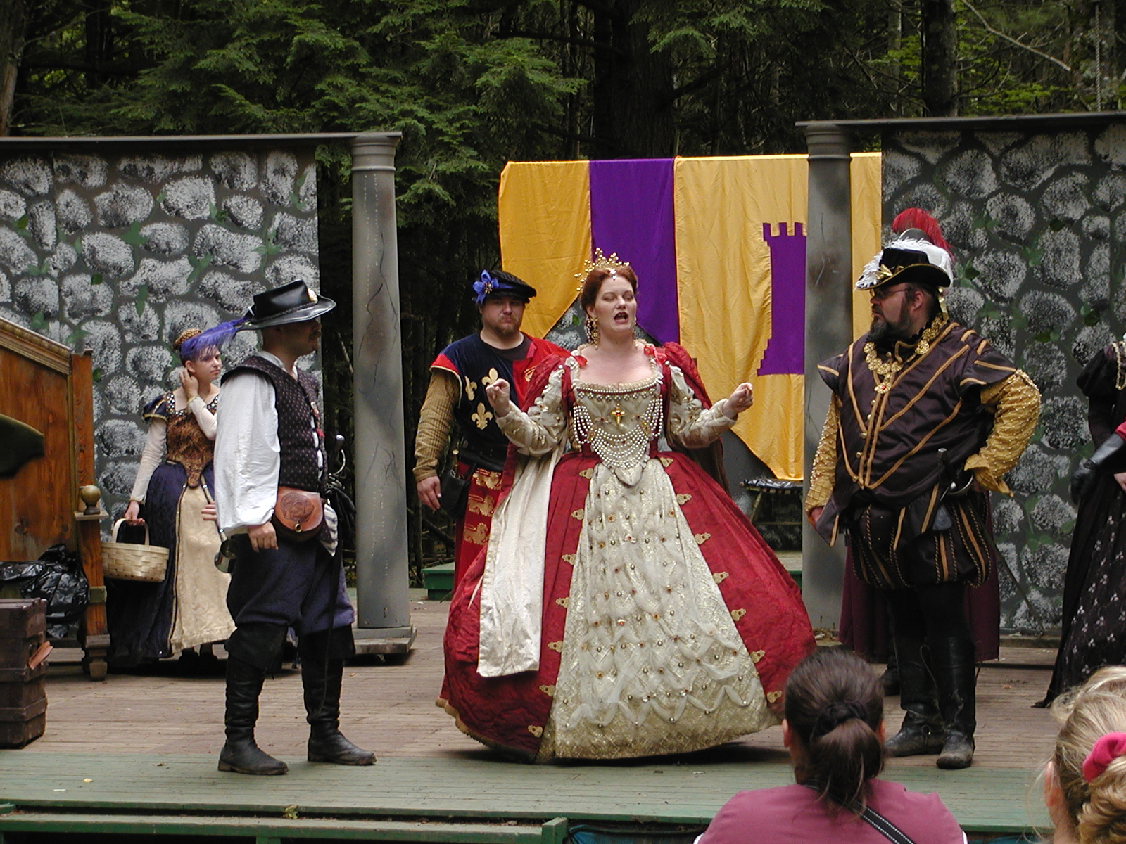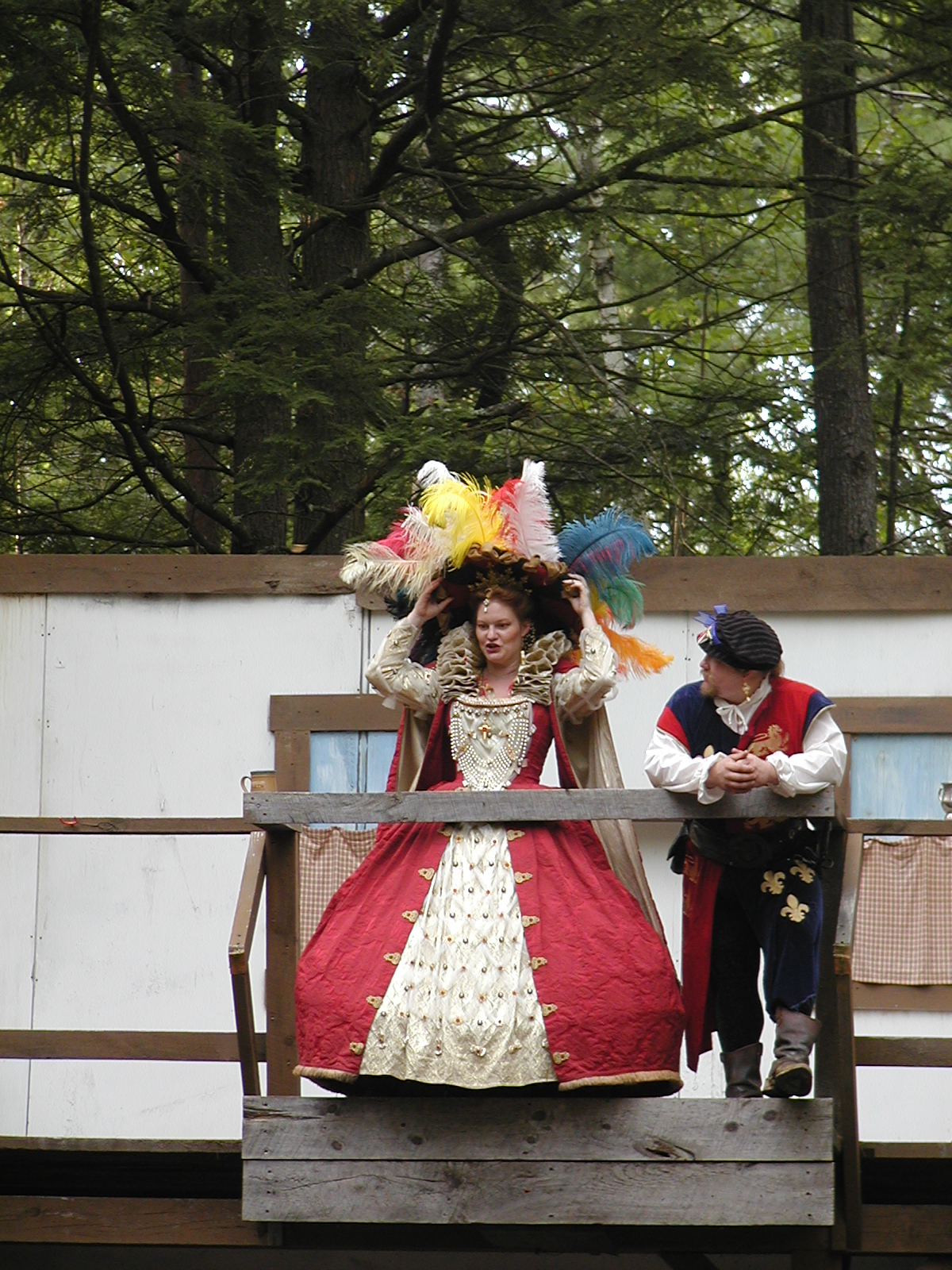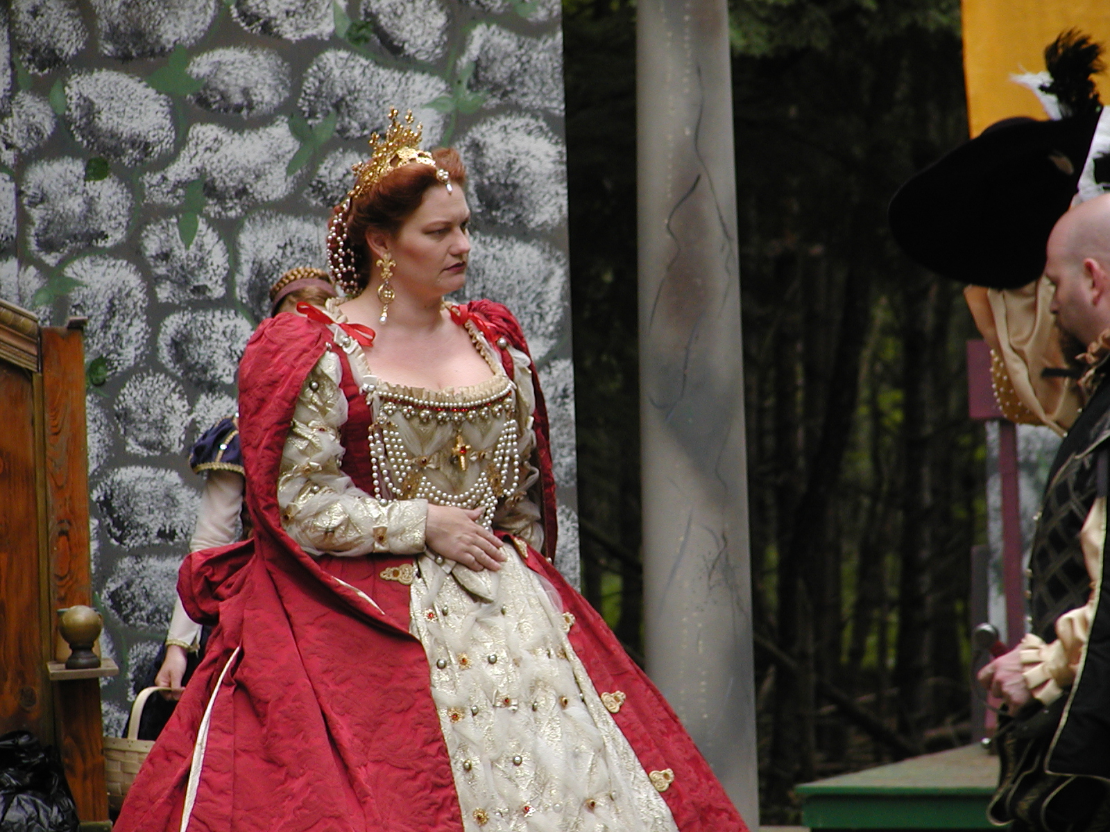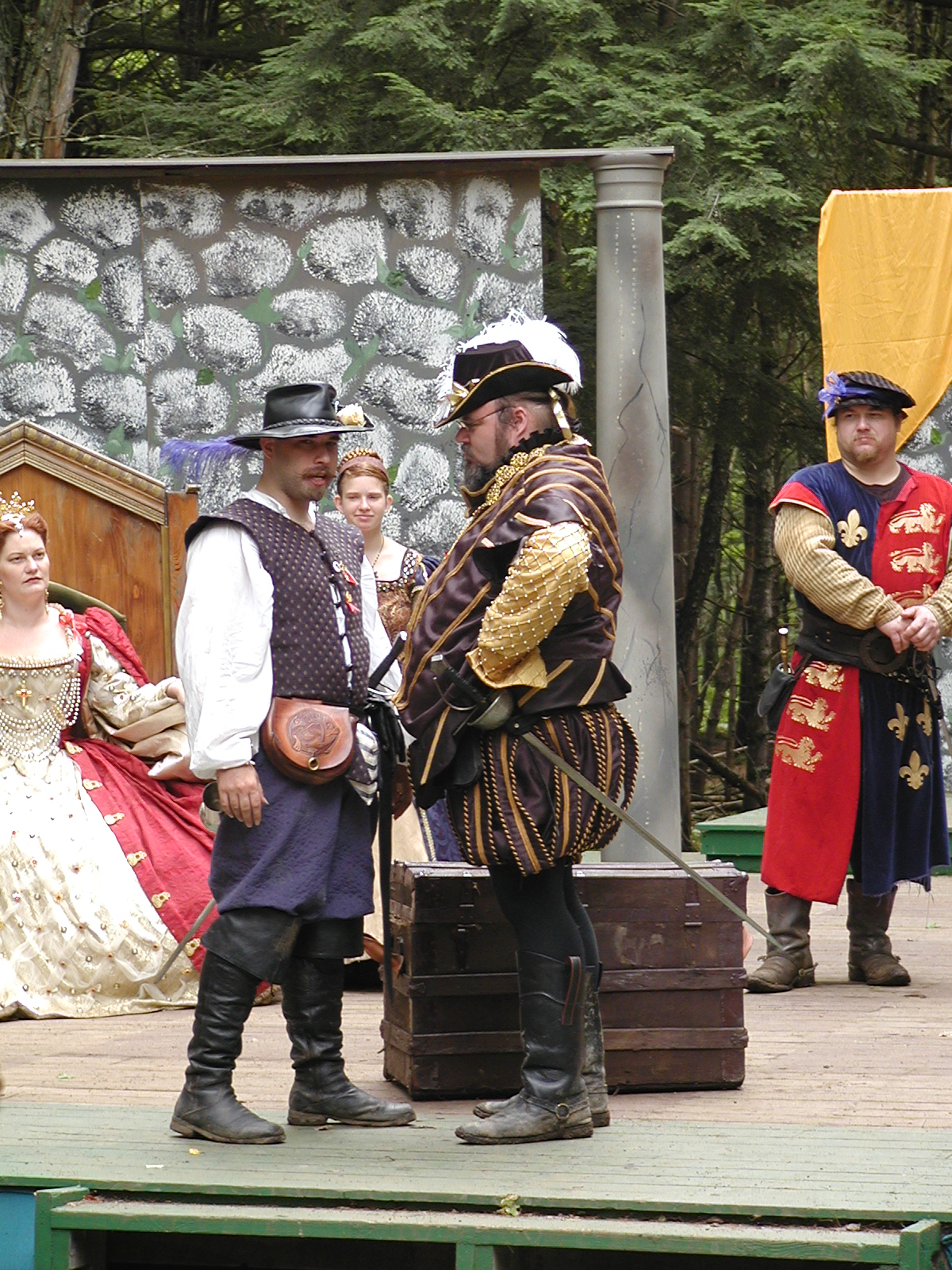 Picture #13: The queen confronts Mendoza and Drake #2 Small: 800x623, 135,070 bytes (132K), (html file) Large: 1600x1200, 1,254,998 bytes (1.2M), (html file) Copyright, Michael Meissner 2003, All rights reserved Olympus C-2100UZ camera f/2.8, ISO 100, 1/125 sec, 17.9mm, auto mode, SHQ, matrix metering 35mm equivalent focal length 99.0mm Taken by Michael Meissner on August 10, 2003 11:17:56 Last modified on August 14, 2003 at 10:50 Shutter speed of 1/125 or 1/250 may indicate use of flash |