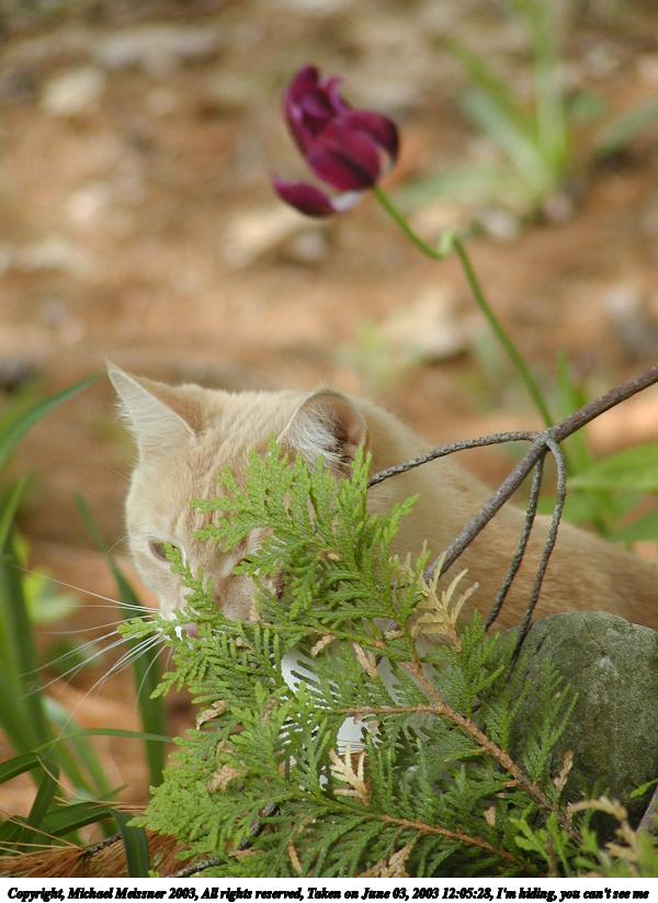 Picture #151: I'm hiding, you can't see me 600x823, 78,106 bytes (77K), (html file) Copyright, Michael Meissner 2003, All rights reserved Olympus C-2100UZ camera f/2.8, ISO 100, 1/200 sec, 45.8mm, auto mode, SHQ, cloudy, matrix metering 35mm equivalent focal length 254.0mm Taken by Michael Meissner on June 03, 2003 12:05:28 Last modified on June 03, 2003 at 15:48 |
