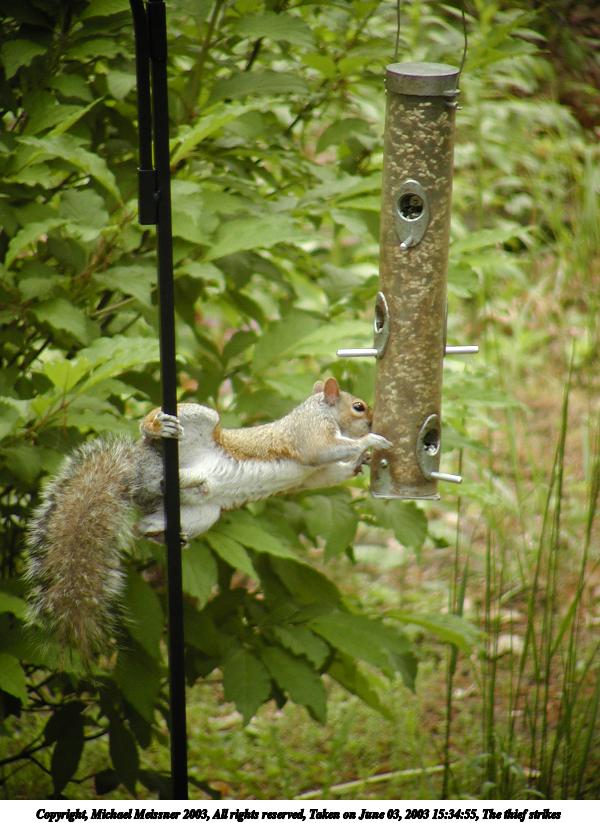 Picture #145: The thief strikes 600x823, 87,904 bytes (86K), (html file) Copyright, Michael Meissner 2003, All rights reserved Olympus C-2100UZ camera f/3.5, ISO 100, 1/100 sec, 65.2mm, auto mode, SHQ, cloudy, matrix metering 35mm equivalent focal length 362.0mm Taken by Michael Meissner on June 03, 2003 15:34:55 Last modified on June 03, 2003 at 16:00 |