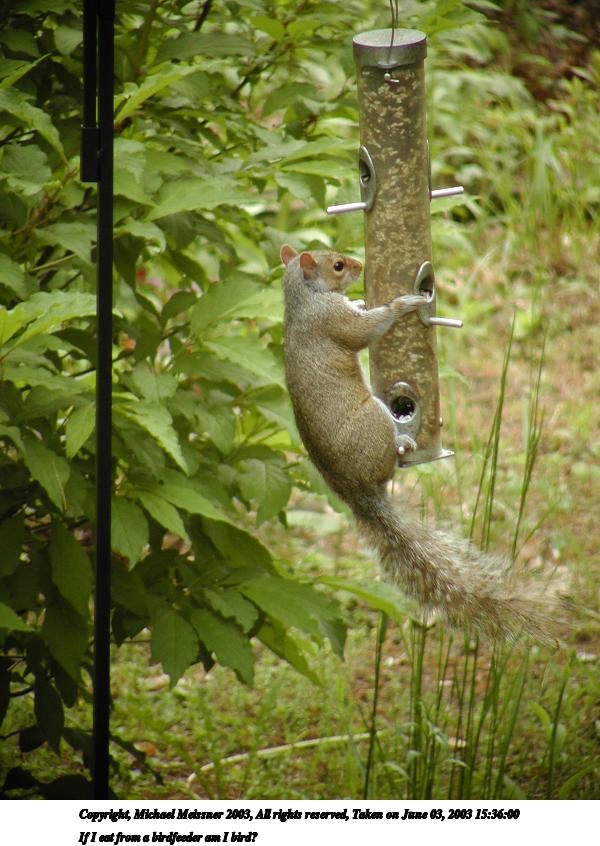 Picture #144: If I eat from a birdfeeder am I bird? 600x846, 92,807 bytes (91K), (html file) Copyright, Michael Meissner 2003, All rights reserved Olympus C-2100UZ camera f/3.5, ISO 100, 1/100 sec, 65.2mm, auto mode, SHQ, cloudy, matrix metering 35mm equivalent focal length 362.0mm Taken by Michael Meissner on June 03, 2003 15:36:00 Last modified on June 03, 2003 at 16:02 |
