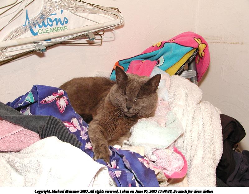 Picture #142: So much for clean clothes 800x623, 93,608 bytes (92K), (html file) Copyright, Michael Meissner 2003, All rights reserved Olympus C-2100UZ camera f/2.8, ISO 200, 1/50 sec, 12.0mm, auto mode, SHQ, cloudy, matrix metering 35mm equivalent focal length 67.0mm Taken by Michael Meissner on June 05, 2003 13:49:28 Last modified on June 08, 2003 at 09:39 |