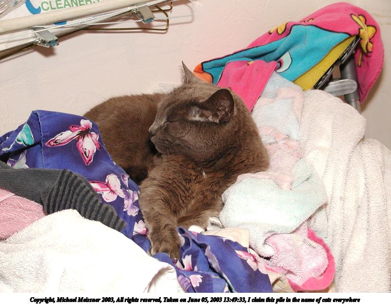 Picture #141: I claim this pile in the name of cats everywhere 800x623, 98,825 bytes (97K), (html file) Copyright, Michael Meissner 2003, All rights reserved Olympus C-2100UZ camera f/2.8, ISO 200, 1/60 sec, 15.2mm, auto mode, SHQ, cloudy, matrix metering 35mm equivalent focal length 84.0mm Taken by Michael Meissner on June 05, 2003 13:49:33 Last modified on June 08, 2003 at 09:40 |