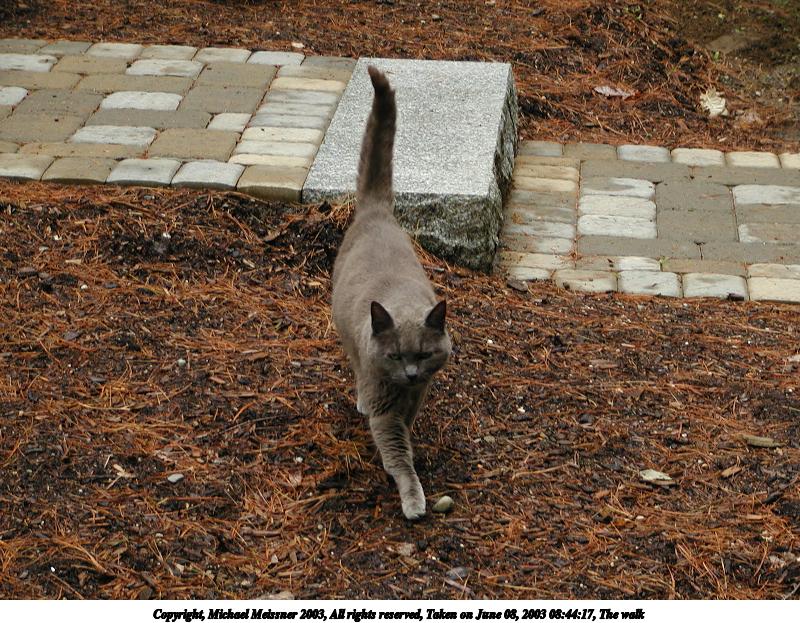 Picture #133: The walk 800x623, 149,638 bytes (147K), (html file) Copyright, Michael Meissner 2003, All rights reserved Olympus C-2100UZ camera f/2.8, ISO 100, 1/125 sec, 21.5mm, auto mode, SHQ, cloudy, matrix metering 35mm equivalent focal length 119.0mm Taken by Michael Meissner on June 08, 2003 08:44:17 Last modified on June 08, 2003 at 13:30 Shutter speed of 1/125 or 1/250 may indicate use of flash |