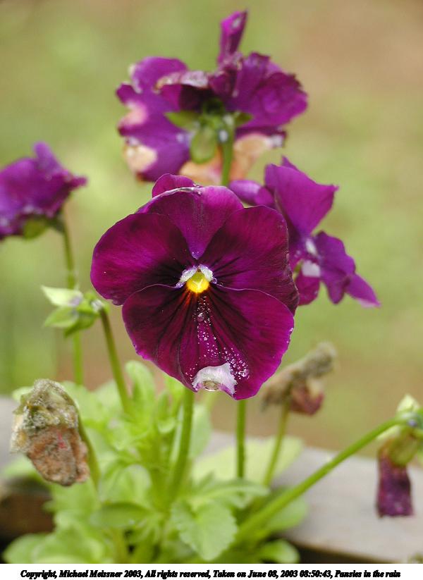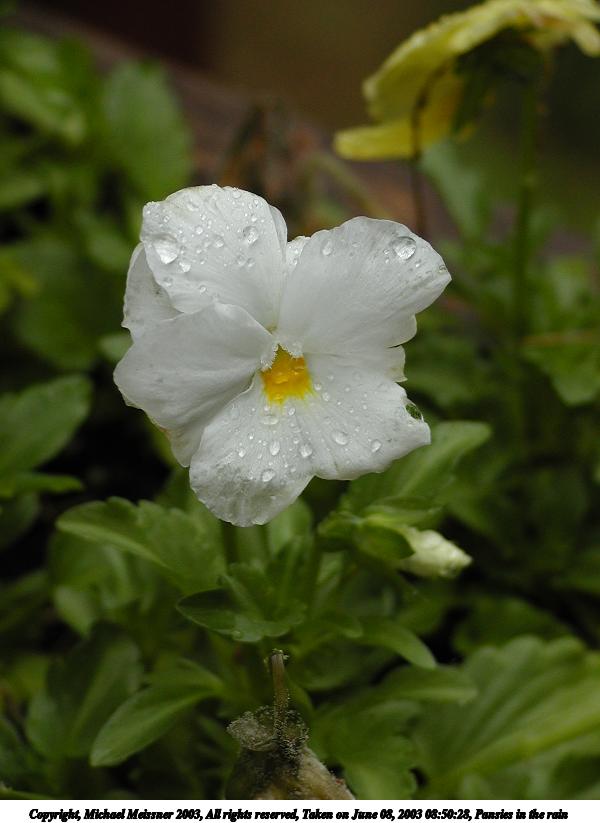 Picture #125: Pansies in the rain #2 600x823, 54,806 bytes (54K), (html file) Copyright, Michael Meissner 2003, All rights reserved Olympus C-2100UZ camera f/2.8, ISO 100, 1/80 sec, 17.9mm, auto mode, SHQ, cloudy, matrix metering 35mm equivalent focal length 99.0mm Taken by Michael Meissner on June 08, 2003 08:50:43 Last modified on June 08, 2003 at 13:36 |