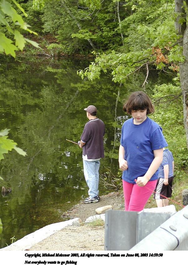 Picture #120: Not everybody wants to go fishing 600x846, 136,084 bytes (133K), (html file) Copyright, Michael Meissner 2003, All rights reserved Olympus C-2100UZ camera f/2.8, ISO 100, 1/250 sec, 22.3mm, auto mode, SHQ, cloudy, matrix metering 35mm equivalent focal length 124.0mm Taken by Michael Meissner on June 08, 2003 14:59:50 Last modified on June 08, 2003 at 22:37 Shutter speed of 1/125 or 1/250 may indicate use of flash |