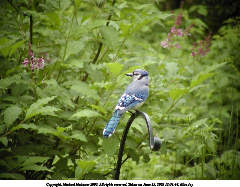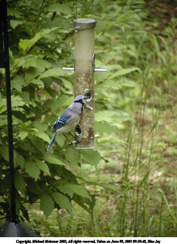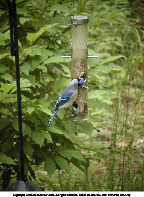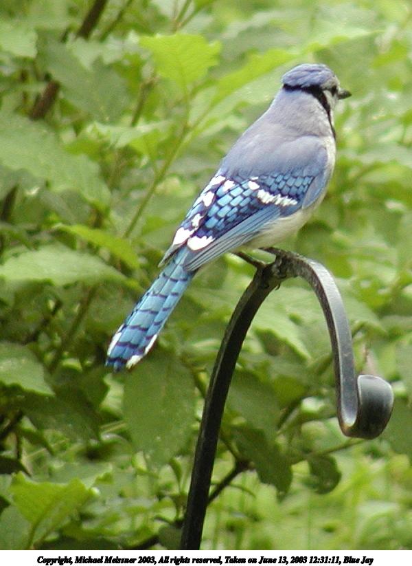 Picture #101: Blue Jay #2 600x823, 86,379 bytes (85K), (html file) Copyright, Michael Meissner 2003, All rights reserved Olympus C-2100UZ camera f/3.5, ISO 400, 1/125 sec, 70.0mm, auto mode, SHQ, cloudy, matrix metering 35mm equivalent focal length 388.0mm Taken by Michael Meissner on June 09, 2003 09:58:48 Last modified on June 11, 2003 at 13:48 Shutter speed of 1/125 or 1/250 may indicate use of flash |