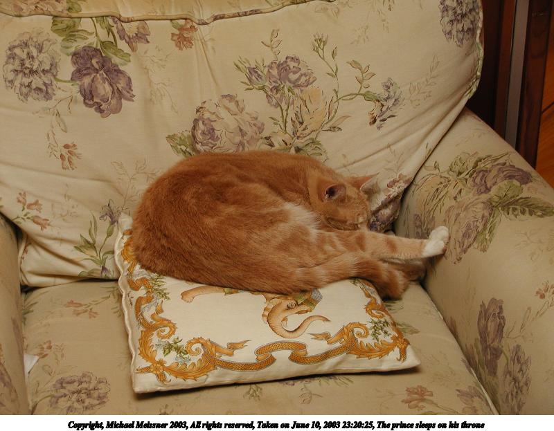 Picture #100: The prince sleeps on his throne 800x623, 83,822 bytes (82K), (html file) Copyright, Michael Meissner 2003, All rights reserved Olympus C-2100UZ camera f/2.8, ISO 100, 1/60 sec, 16.2mm, auto mode, SHQ, cloudy, matrix metering 35mm equivalent focal length 90.0mm Taken by Michael Meissner on June 10, 2003 23:20:25 Last modified on June 11, 2003 at 13:49 |