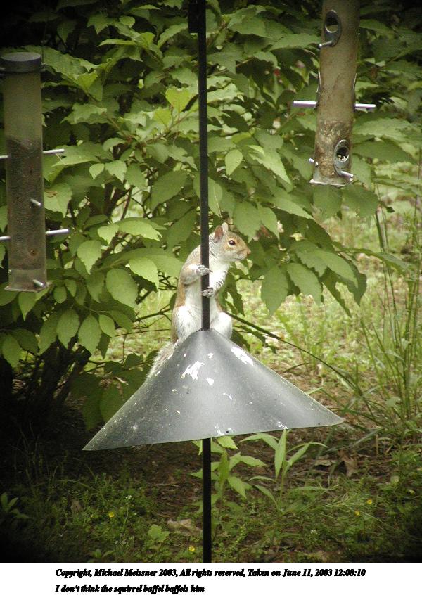 Picture #98: I don't think the squirrel baffel baffels him 600x846, 107,594 bytes (106K), (html file) Copyright, Michael Meissner 2003, All rights reserved Olympus C-2100UZ camera f/3.5, ISO 400, 1/650 sec, 51.0mm, auto mode, SHQ, cloudy, matrix metering 35mm equivalent focal length 283.0mm Taken by Michael Meissner on June 11, 2003 12:08:10 Last modified on June 11, 2003 at 13:54 |