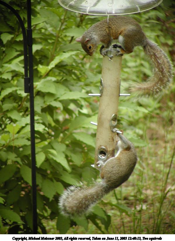 Picture #95: Two squirrels 600x823, 79,468 bytes (78K), (html file) Copyright, Michael Meissner 2003, All rights reserved Olympus C-2100UZ camera f/3.5, ISO 100, 1/100 sec, 65.2mm, auto mode, SHQ, cloudy, matrix metering 35mm equivalent focal length 362.0mm Taken by Michael Meissner on June 11, 2003 12:40:13 Last modified on June 11, 2003 at 13:57 |