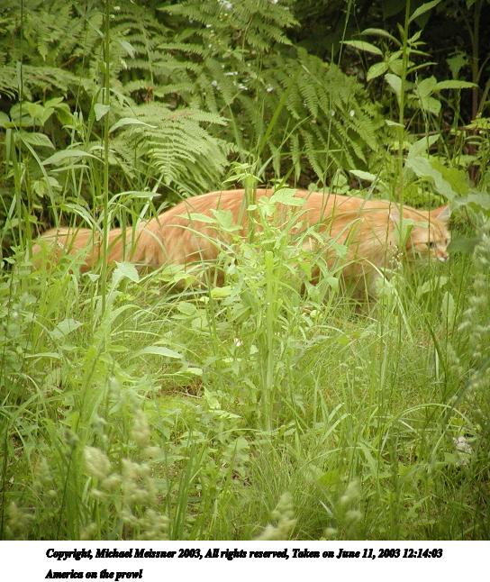 Picture #91: America on the prowl 544x646, 94,401 bytes (93K), (html file) Copyright, Michael Meissner 2003, All rights reserved Olympus C-2100UZ camera f/3.2, ISO 200, 1/320 sec, 51.0mm, auto mode, SHQ, cloudy, matrix metering 35mm equivalent focal length 283.0mm Taken by Michael Meissner on June 11, 2003 12:14:03 Last modified on June 11, 2003 at 14:30 |