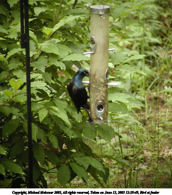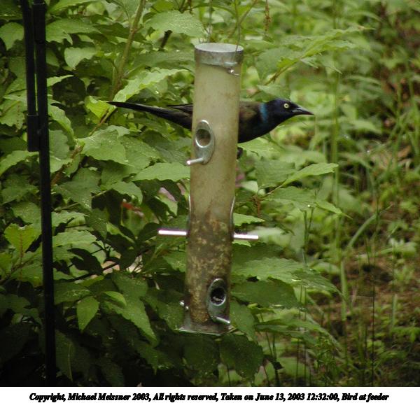 Picture #85: Bird at feeder 600x708, 78,449 bytes (77K), (html file) Copyright, Michael Meissner 2003, All rights reserved Olympus C-2100UZ camera f/3.2, ISO 200, 1/200 sec, 61.0mm, auto mode, SHQ, cloudy, matrix metering 35mm equivalent focal length 338.0mm Taken by Michael Meissner on June 13, 2003 12:29:40 Last modified on June 13, 2003 at 15:59 |